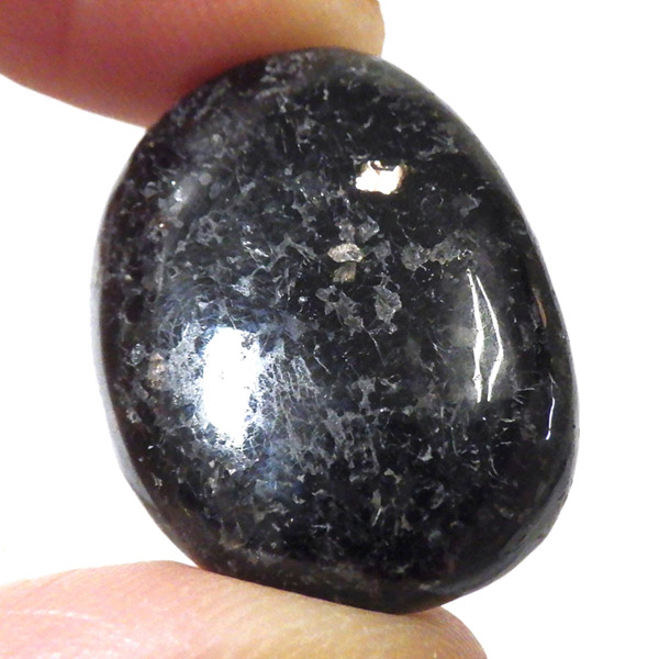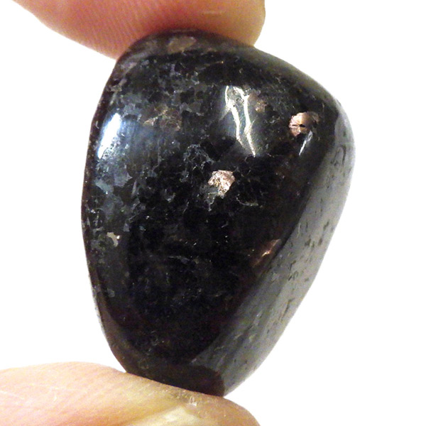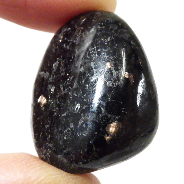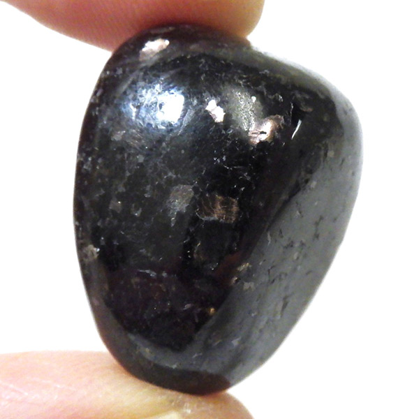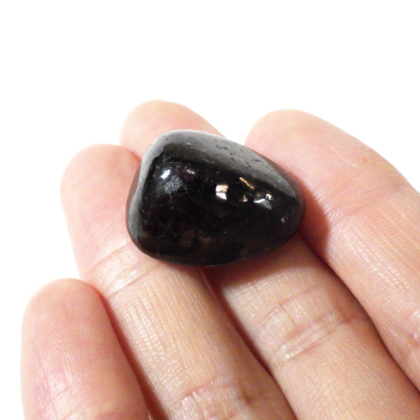 チャイナ産のヌーマイト、タンブルです。ヌーマイトは、1982年にグリーンランドのヌーク地方で発見され、地名に因んで名づけられました。ヌーマイト自体は30億年前から地球に存在したといわれる石で、気の遠くなるような年月を経て現代に現れた石だといわれています。和名は角閃石片麻岩。アンソフィライトやゲドライト、石英、など多様なミネラルを含んだ変成岩といわれています。チャイナ産のヌーマイトは一見、真っ黒い石に見えますが、光の角度によって鮮やかなブロンズやシルバーの閃光を示します。