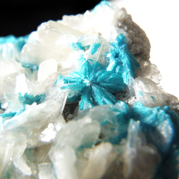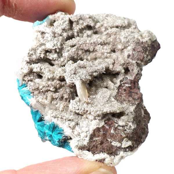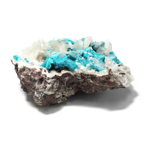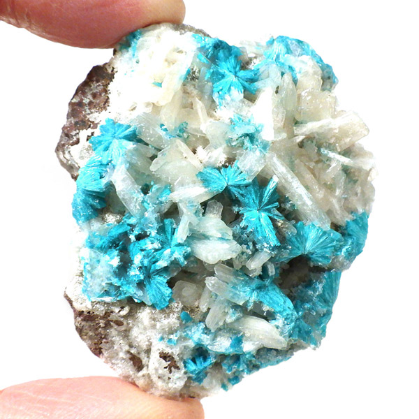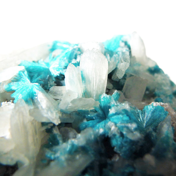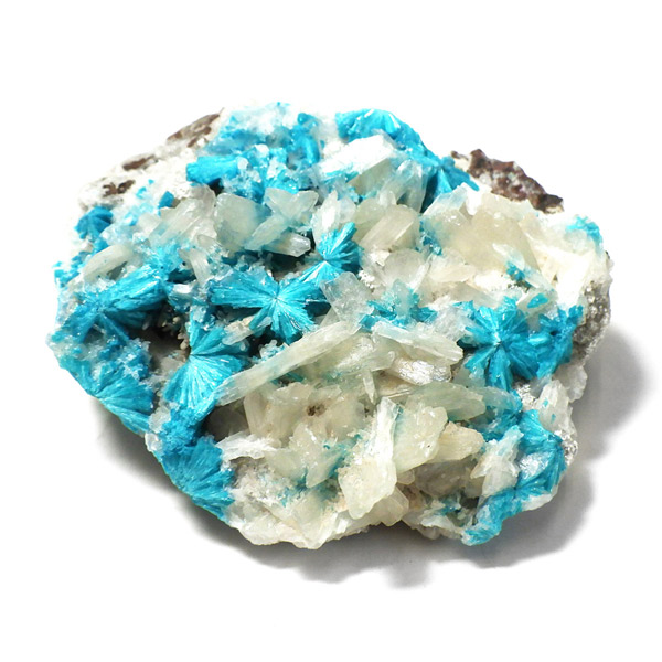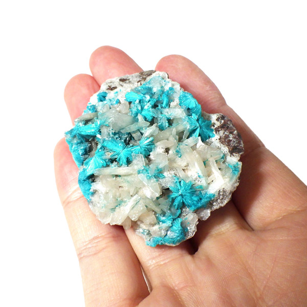 インド、プネー産のカバンサイト原石です。カバンサイトは、沸石の中でも人気を誇る、美しいビビッドな青い発色が魅力的です。きれいな結晶で愛嬌のあるその形は、多くのファンに愛されています。白い板状の結晶は束沸石(スティルバイト)。カバンサイトは主成分の、「カルシウム」「バナジウム」「シリコン」の3つの頭文字をつなげて「カバンサイト」と付けられたのが名前の由来です。1973年にアメリカで発見された、まだ歴史の浅い石で、発見されたのはアメリカですが、現在ではまずアメリカでは採れず、インドで採掘が続けられています。カバンサイト、スティルバイト共に結晶の数が多く、カバンサイトの花が咲き誇ったような見事な標本です。