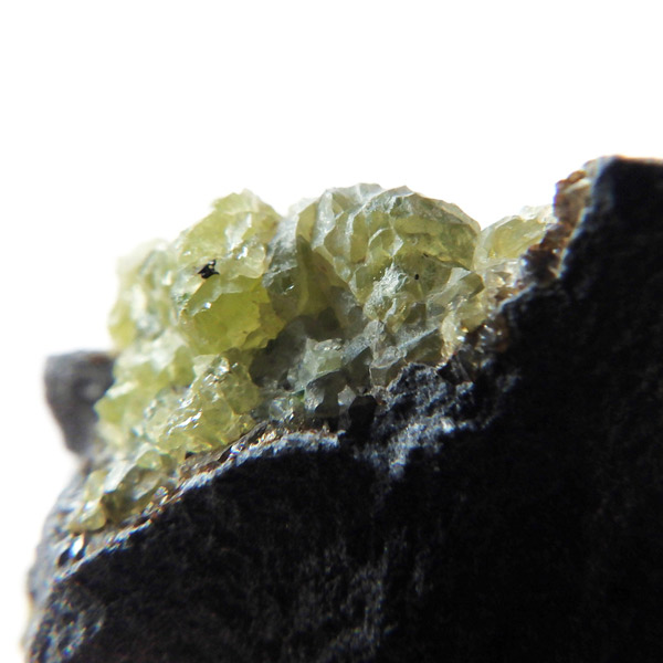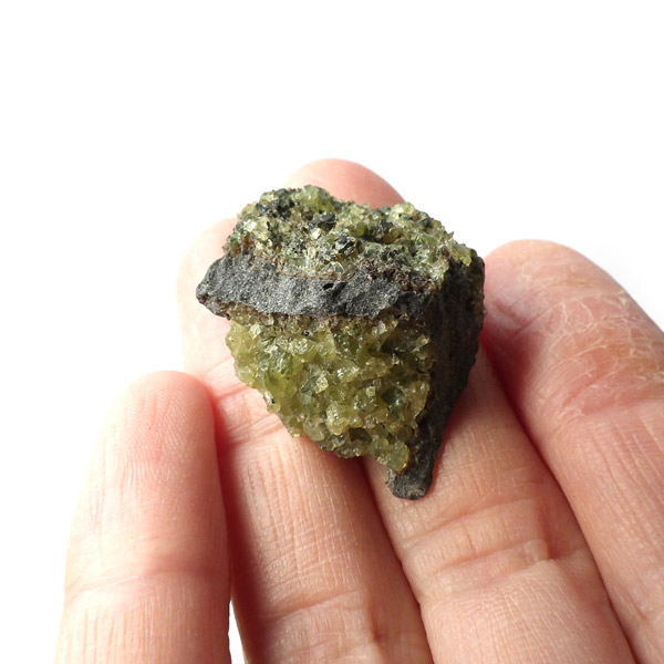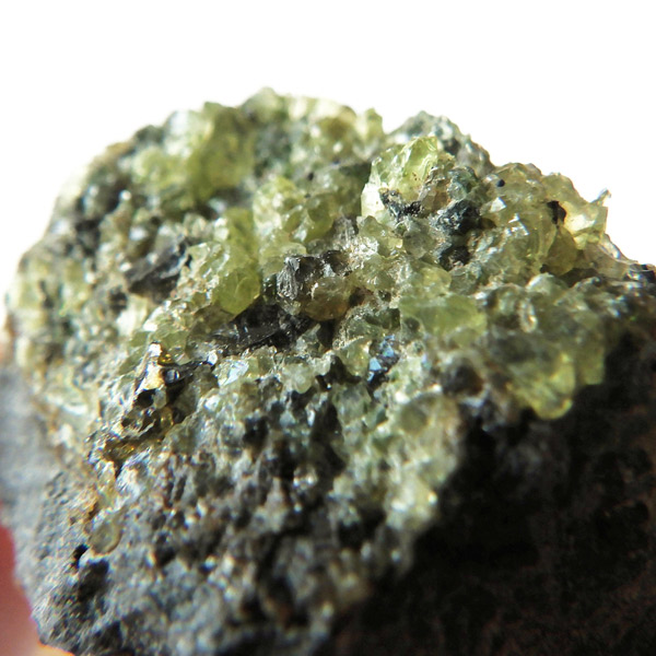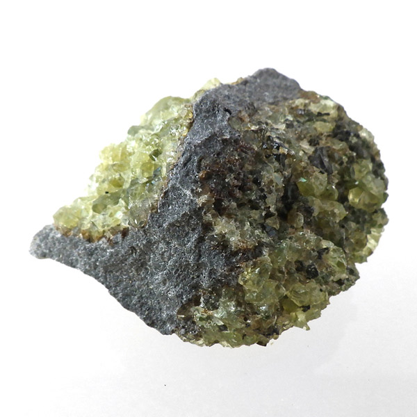 アメリカ・アリゾナ州産のペリドット母岩付き原石です。鉱物名をオリビンと呼ぶのですが、日本では宝石名のペリドットが浸透しています。和名は橄欖(かんらん)石といいます。主にグリーンの結晶がかんらん石でグレーの母岩が玄武岩です。かんらん石は月の岩石や石質隕石、石鉄隕石にも含まれており、鉄の含有量によって、白色から黒色まで色調が変化します。かんらん石は地球の上部マントルの主要構成鉱物でマグマの噴火によって溶岩の塊に運ばれて地表に出てきます。まさにその姿を切り取ったようなこの原石は、様々な濃淡の結晶が多面にわたり観察できます。