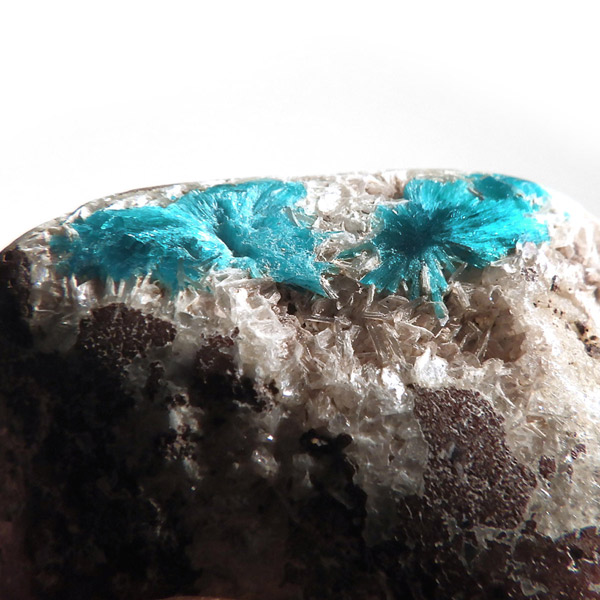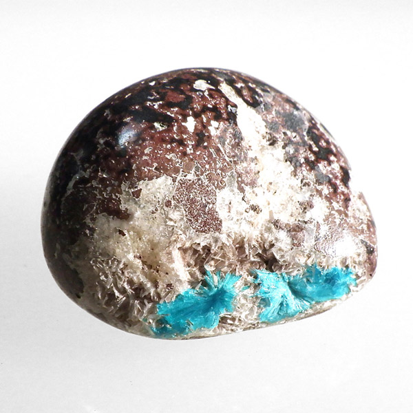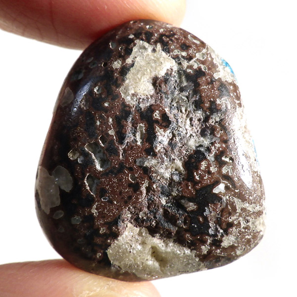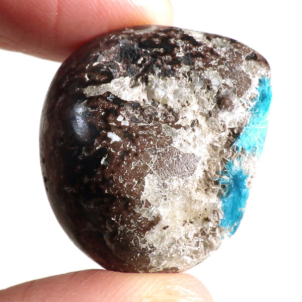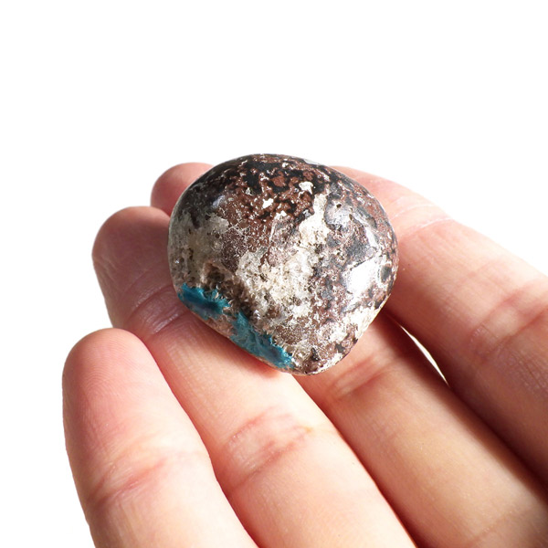 インド産のカバンサイト、タンブルです。 カバンサイトは、沸石の中でも人気を誇る、美しいビビッドな青い発色が魅力です。主成分の、「カルシウム」「バナジウム」「シリコン」の3つの頭文字をつなげて「カバンサイト」と付けられたのが名前の由来です。 1973年にアメリカで発見された、まだ歴史の浅い石で、発見されたのはアメリカですが、現在ではまずアメリカでは採れず、インドで採掘が続けられています。 本来 カバンサイトは、沸石に属し、モース硬度が低い上に、ボンボリ状の形状から加工には不向きなミネラルとして知られています。そのため、ルースやタンブルに加工することは非常に難しいのですが、今回ご用意した商品は、母岩共々加工する事で、ようやくタンブルとしてご案内できる超レアなものとなります。