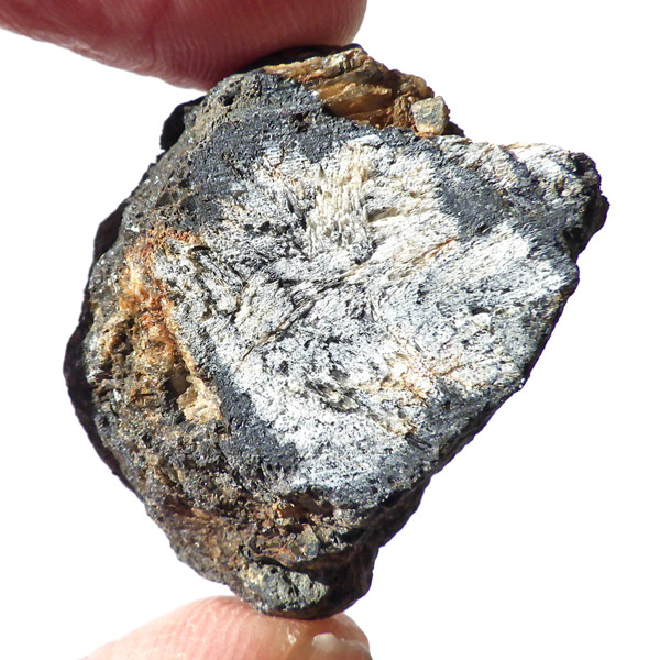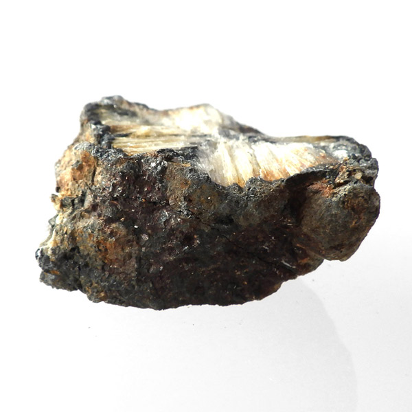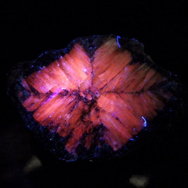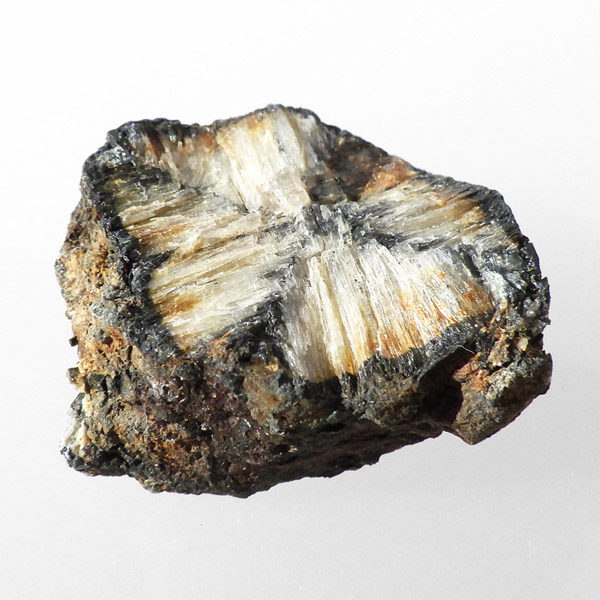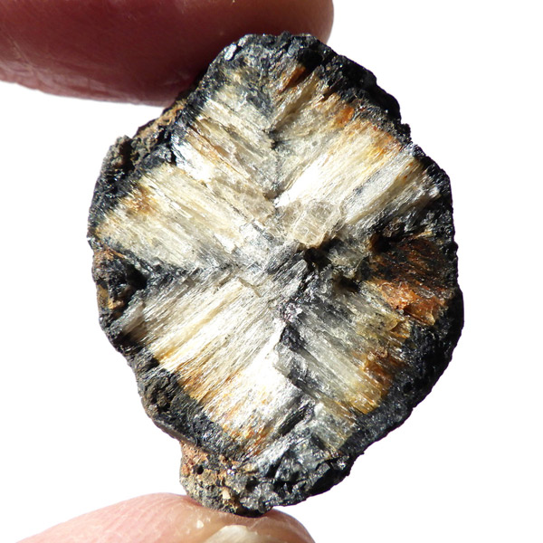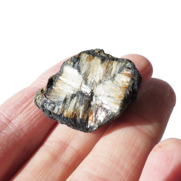 ロシア産、キャストライト原石です。キャストライトは黒の十字模様が大変魅力的な石です。キャストライトの名前は、輪切りにすると黒い十字の模様が現れることから、ギリシャ語で「対角線的な配列」という意味の「Chiastos」に由来しています。キャストライトは、黒鉛(グラファイト)などの黒色含有物を対称的に含んだ紅柱石です。クロスストーンとも呼ばれ、粘板岩と花こう岩の接触部に産出します。劈開がありますのできれいに輪切りができます。紅柱石部分は主に白色の集合で光沢があります。きれいな十字に結晶する様に鉱物の神秘を感じますね。365nmのUVライトで赤色の蛍光を確認しました。