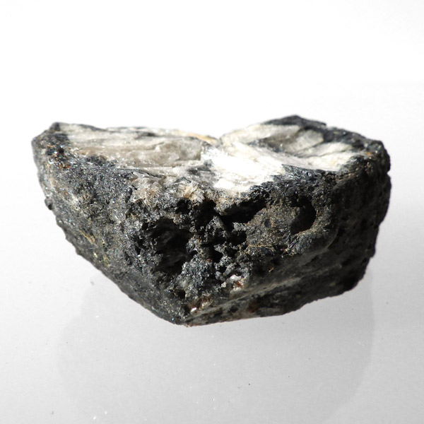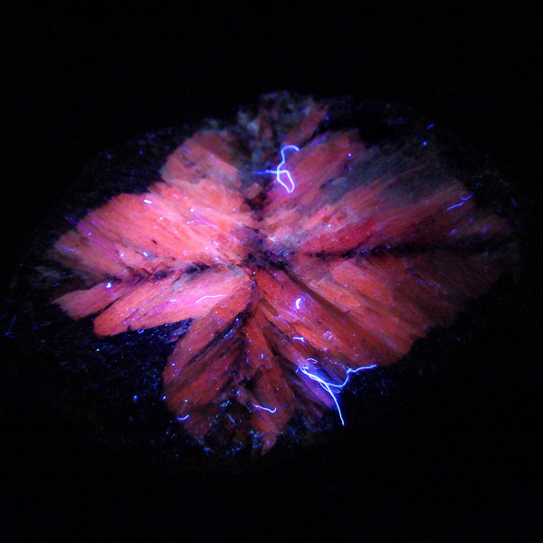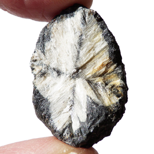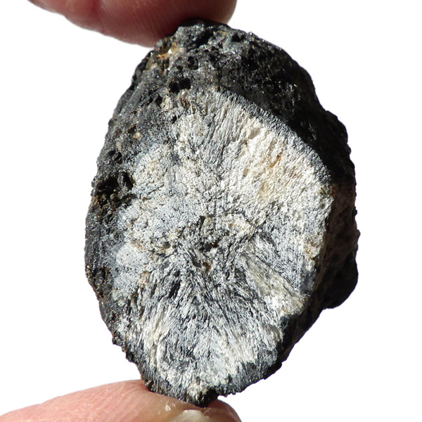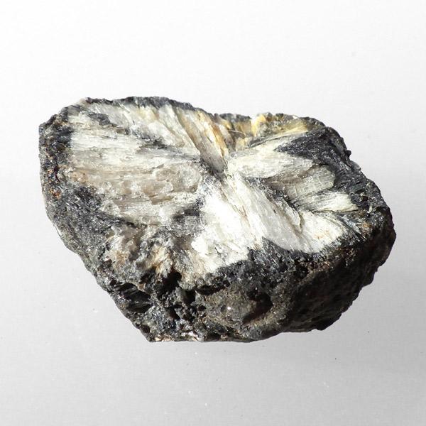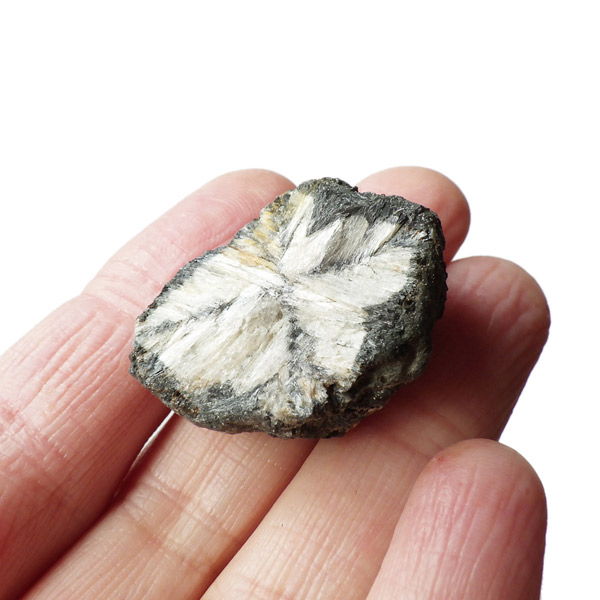ロシア産、キャストライト原石です。キャストライトは黒の十字模様が大変魅力的な石です。キャストライトの名前は、輪切りにすると黒い十字の模様が現れることから、ギリシャ語で「対角線的な配列」という意味の「Chiastos」に由来しています。キャストライトは、黒鉛(グラファイト)などの黒色含有物を対称的に含んだ紅柱石です。クロスストーンとも呼ばれ、粘板岩と花こう岩の接触部に産出します。劈開がありますのできれいに輪切りができます。紅柱石部分は主に白色の集合で光沢があります。きれいな十字に結晶する様に鉱物の神秘を感じますね。365nmのUVライトで赤色の蛍光を確認しました。