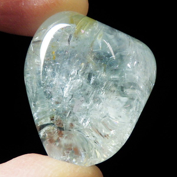 ブラジル産のブルートパーズ、タンブルです。トパーズは様々な色を持つ鉱物であり、和名を「黄玉(おうぎょく)」というように、本来は「黄色からオレンジ色」のトパーズがスタンダードなカラーとなっています。その中でも、青色を発するものがブルートパーズと呼ばれています。しかし、青色のトパーズが天然で生まれることは大変希少であり、現在はほとんど見つかることがありません。そのため、市場で流通しているブルートパーズのほとんどは、ホワイトトパーズに放射処理が施されています。今回ご用意したブルートパーズは、まさに天然のもので、大変希少価値の高いものです。