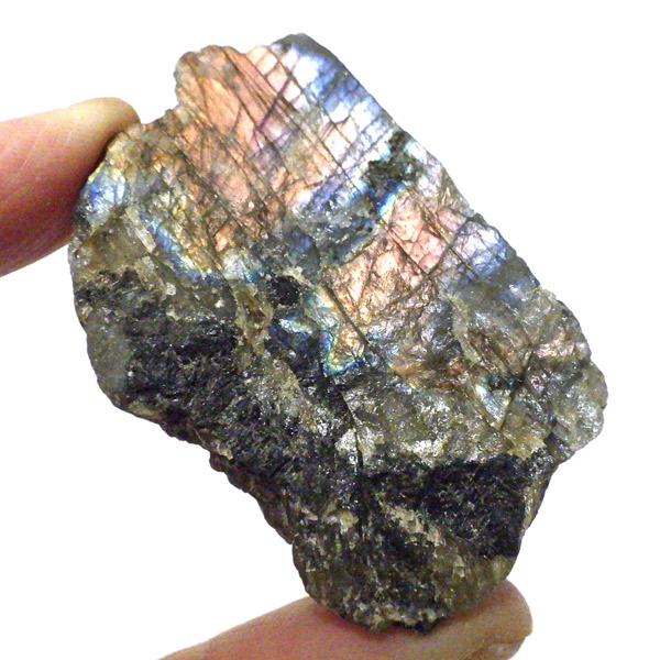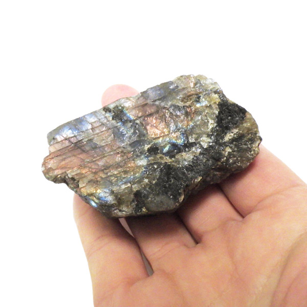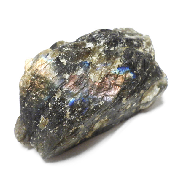 カナダ産、ラブラドライトの原石です。ラブラドライトはブルーやゴールドなどのラブラドレッセンスが魅力の石。見る角度によってオーロラのような色彩を変える美しい光を持つのが特徴です。石自体はグレーなどの地味めな色合いをしていますが、そこに鮮やかな輝きが浮かび上がるところから「アゲハ蝶の羽」に例えられる事もある美しい石です。