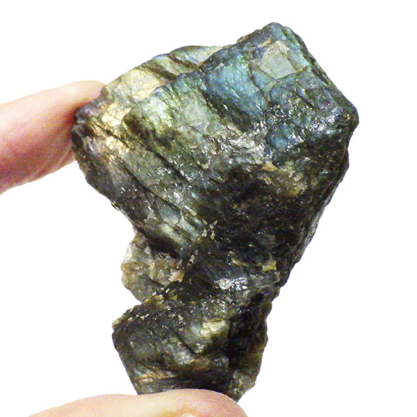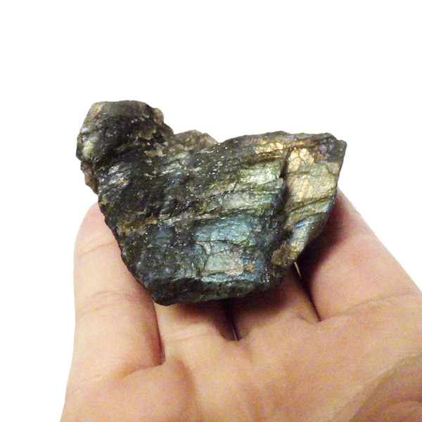 カナダ産、ラブラドライトの原石です。ラブラドライトはブルーやゴールドなどのラブラドレッセンスが魅力の石。見る角度によってオーロラのような色彩を変える美しい光を持つのが特徴です。石自体はグレーなどの地味めな色合いをしていますが、そこに鮮やかな輝きが浮かび上がるところから「アゲハ蝶の羽」に例えられる事もある美しい石です。