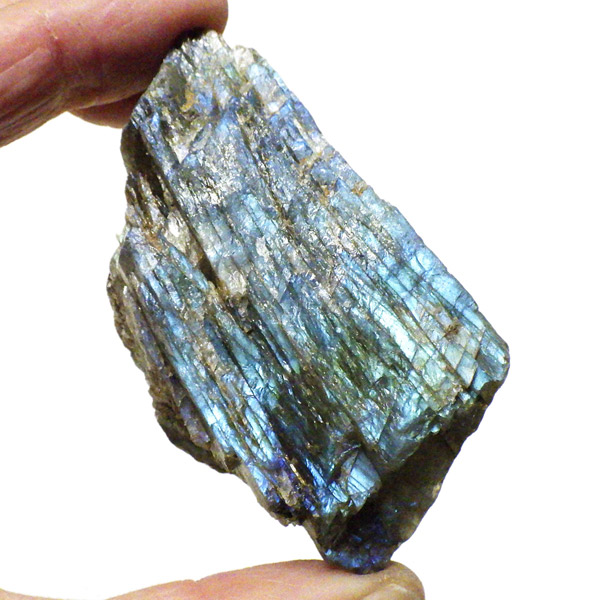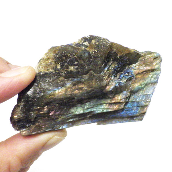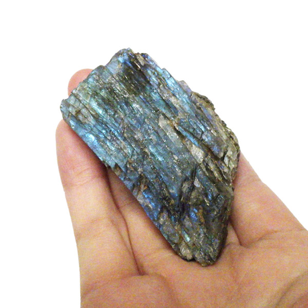 カナダ産、ラブラドライトの原石です。ラブラドライトはブルーやゴールドなどのラブラドレッセンスが魅力の石。見る角度によってオーロラのような色彩を変える美しい光を持つのが特徴です。石自体はグレーなどの地味めな色合いをしていますが、そこに鮮やかな輝きが浮かび上がるところから「アゲハ蝶の羽」に例えられる事もある美しい石です。