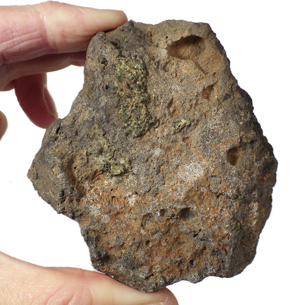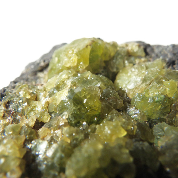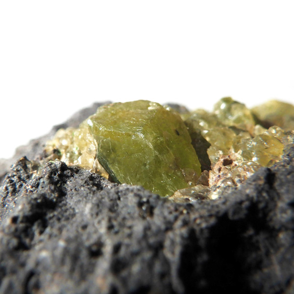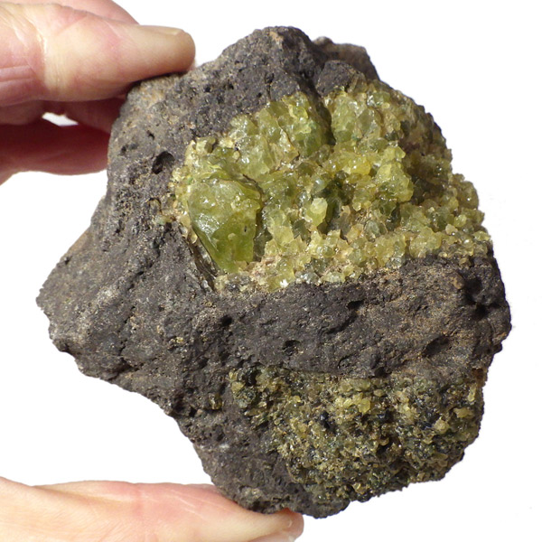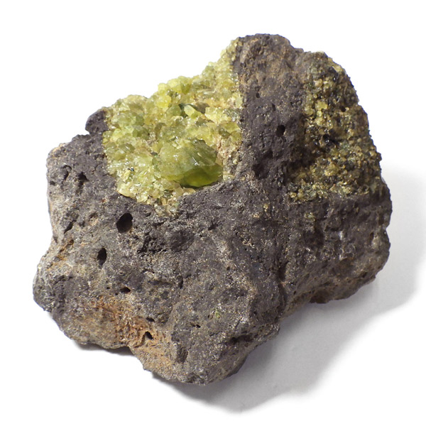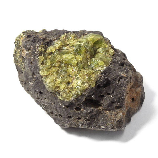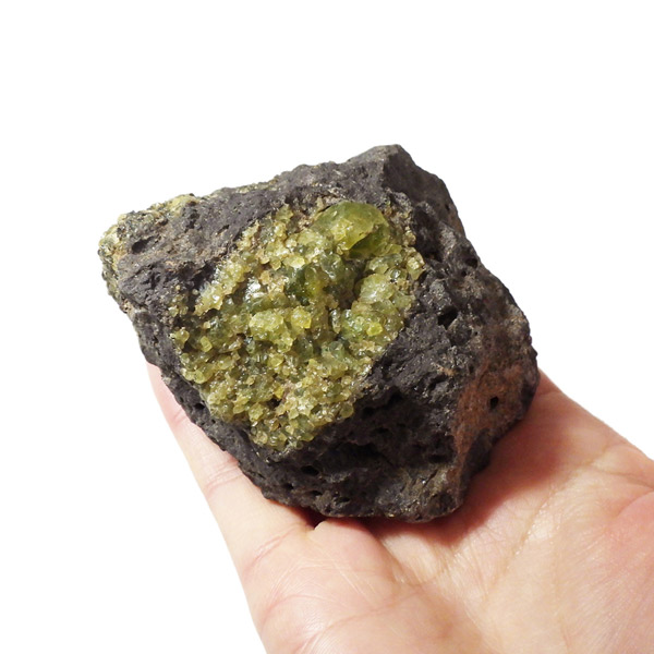 アメリカ・アリゾナ州産のペリドット母岩付き原石です。鉱物名をオリビンと呼ぶのですが、日本では宝石名のペリドットが浸透しています。和名は橄欖(かんらん)石といいます。主にグリーンの結晶がかんらん石でグレーの母岩が玄武岩です。かんらん石は月の岩石や石質隕石、石鉄隕石にも含まれており、鉄の含有量によって、白色から黒色まで色調が変化します。かんらん石は地球の上部マントルの主要構成鉱物でマグマの噴火によって溶岩の塊に運ばれて地表に出てきます。まさにその姿を切り取ったようなこの原石は、様々な濃淡の結晶が多面にわたり観察できます。