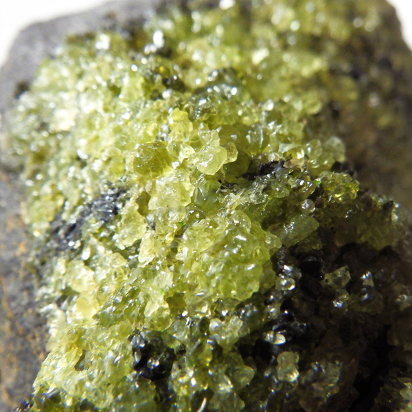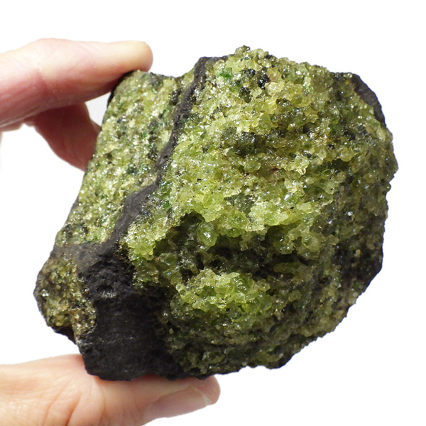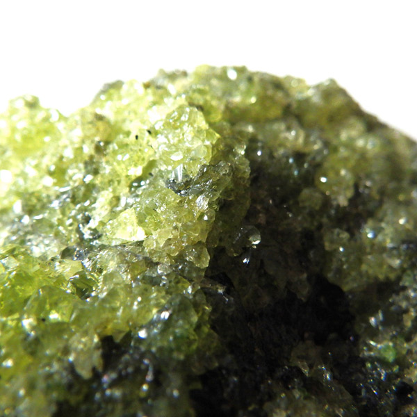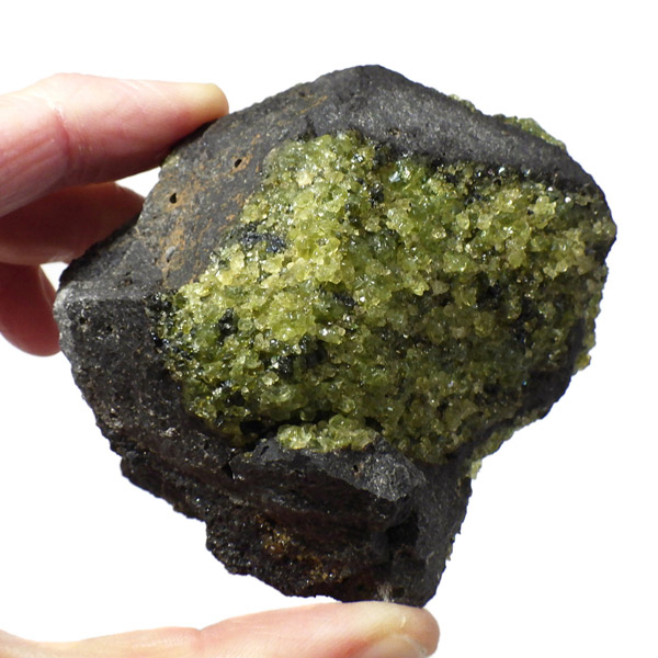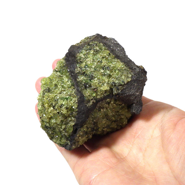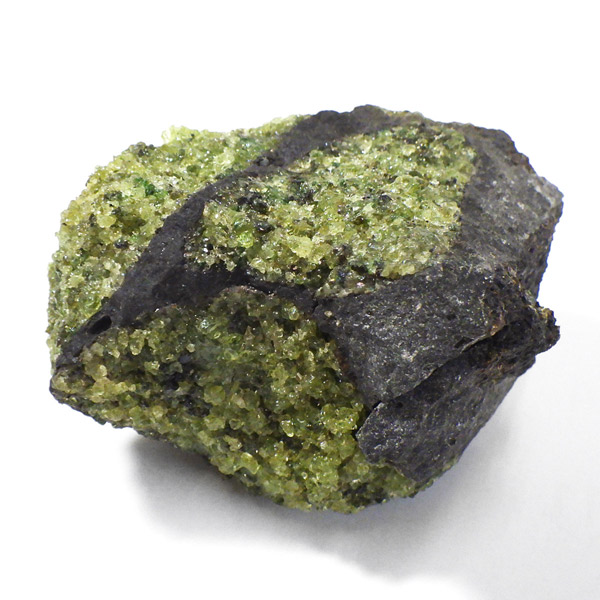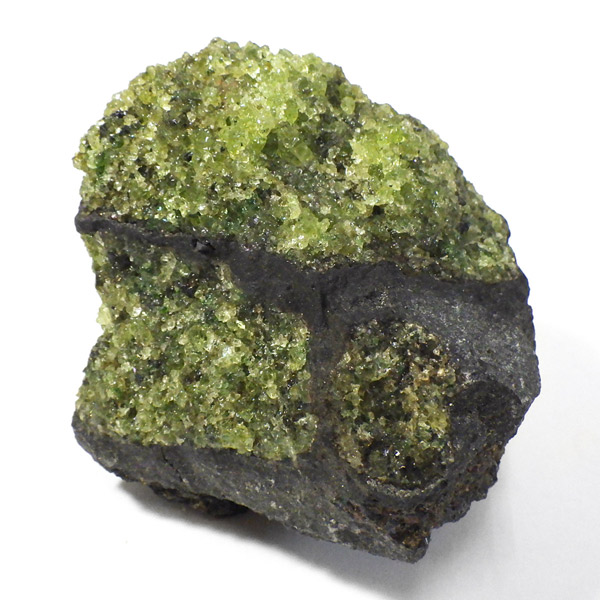 アメリカ・アリゾナ州産のペリドット母岩付き原石です。鉱物名をオリビンと呼ぶのですが、日本では宝石名のペリドットが浸透しています。和名は橄欖(かんらん)石といいます。主にグリーンの結晶がかんらん石でグレーの母岩が玄武岩です。かんらん石は月の岩石や石質隕石、石鉄隕石にも含まれており、鉄の含有量によって、白色から黒色まで色調が変化します。かんらん石は地球の上部マントルの主要構成鉱物でマグマの噴火によって溶岩の塊に運ばれて地表に出てきます。まさにその姿を切り取ったようなこの原石は、様々な濃淡の結晶が多面にわたり観察できます。