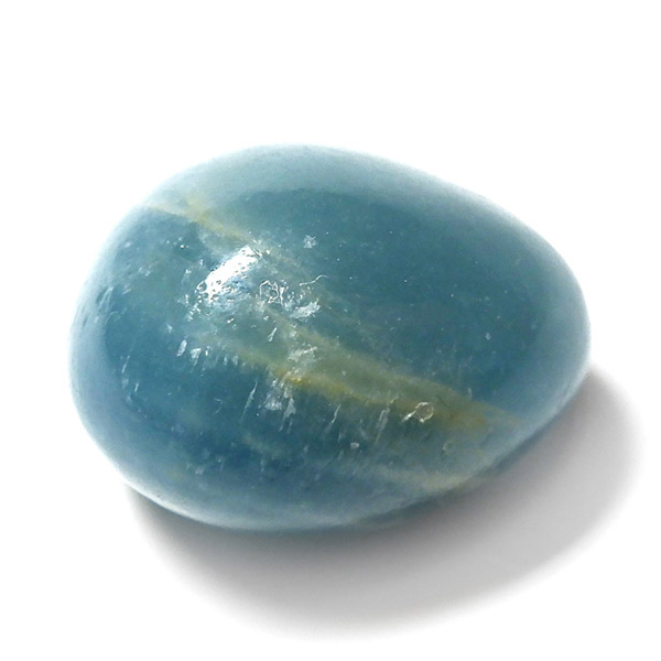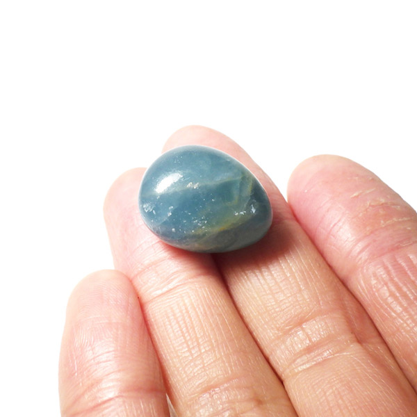 アルゼンチン産のブルーカルサイト、タンブルです。 カルサイトは、イエロー、ブルー、ピンクなど様々な色合いを持つ石です。これらの色は、鉱物内に含まれている成分により色が異なります。カルサイトの中で青色のものがブルーカルサイトと呼ばれます。ブルーカルサイトには大きく分けて「若干透明感がある鮮やかな色合い」「ミルキーで淡い色合い」の2種類に分かれます。これらは産出される場所によって異なります。ブルーカルサイトの中でもミルキータイプよりも、色味の鮮やかなタイプは産地が限られることから希少性が高くなります。その中でも特にアルゼンチンで採れるものは優れた発色からアクアティンカルサイトと特別に呼んでいます。