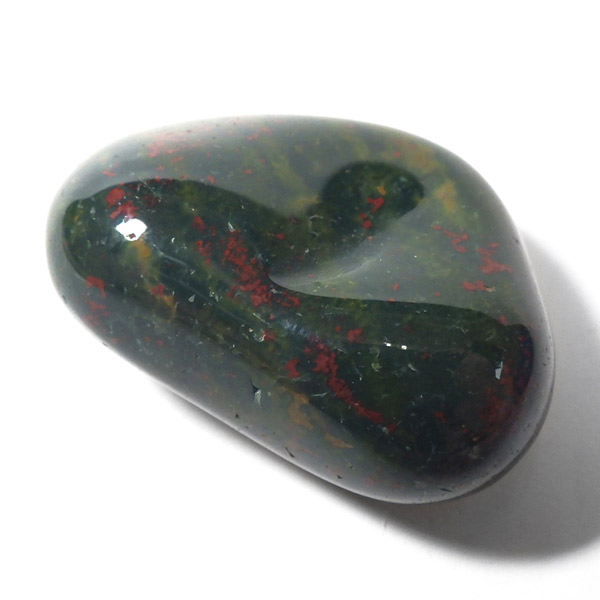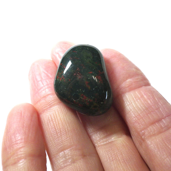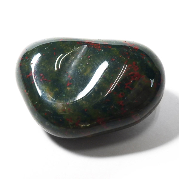 インド産のブラッドストーン、タンブルです。ブラッドストーンはジャスパーの一種で濃緑色の地に赤い斑点や模様の入った石です。鉄に起因する赤い斑点が見られる石で、赤斑点が血の様に見られることからブラッドストーンと呼ばれています。