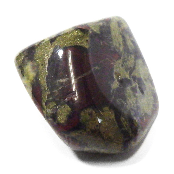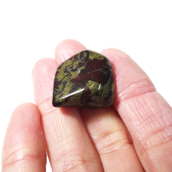 現在では南アフリカまたはオーストラリアで産出される石のようです。ドラゴンストーンまたはドラゴンブラッドジャスパーと呼ばれます。これは、ドラゴンの皮膚を思わせる緑色に、ドラゴンの血をイメージさせる赤い点や筋が入っていることから名付けられています。日本ではあまり文献がないのですが基本はジャスパーだと思われます。こちらは磨いたタンブルですが、原石の状態ですとドラゴン模様の緑の石に本当にドラゴンの血が付いたのではと思わせられます。見た目は綺麗というよりは力強くかっこいい石です。