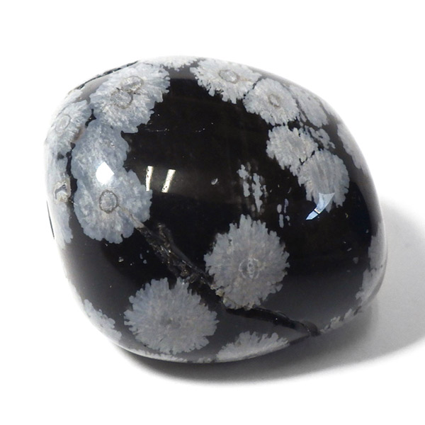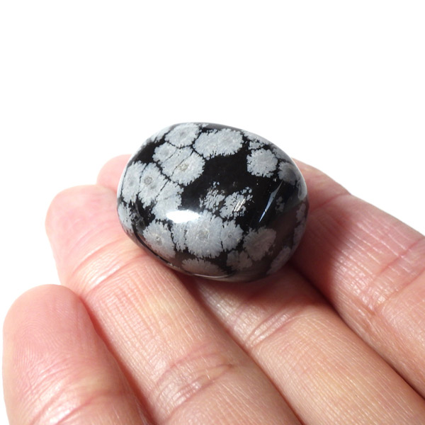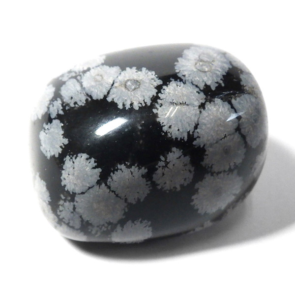 メキシコ産のスノーフレークオブシディアン、タンブルです。オブシディアンは、火山性の天然ガラスです。その中にクリストバライトという火山性鉱物が入り込んで、白い斑点模様を織り成しているのです。表面に雪の結晶のような模様が見えるのが特徴です。