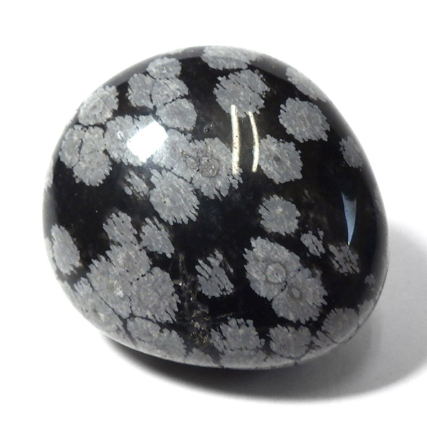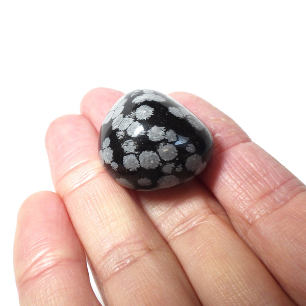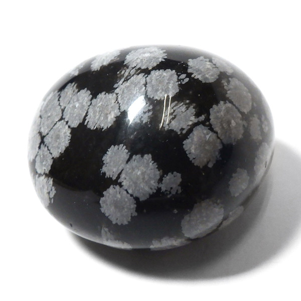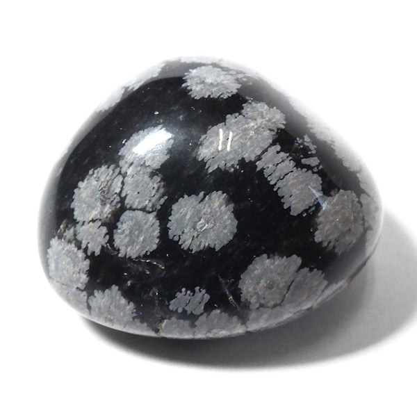 メキシコ産のスノーフレークオブシディアン、タンブルです。オブシディアンは、火山性の天然ガラスです。その中にクリストバライトという火山性鉱物が入り込んで、白い斑点模様を織り成しているのです。表面に雪の結晶のような模様が見えるのが特徴です。