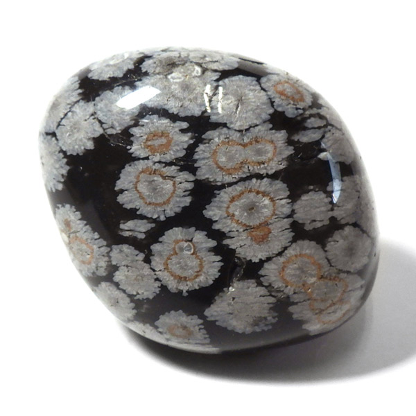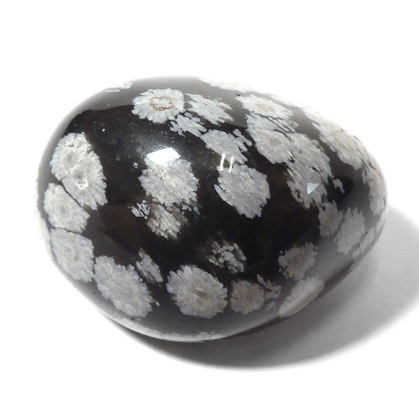 メキシコ産のスノーフレークオブシディアン、タンブルです。オブシディアンは、火山性の天然ガラスです。その中にクリストバライトという火山性鉱物が入り込んで、白い斑点模様を織り成しているのです。表面に雪の結晶のような模様が見えるのが特徴です。
