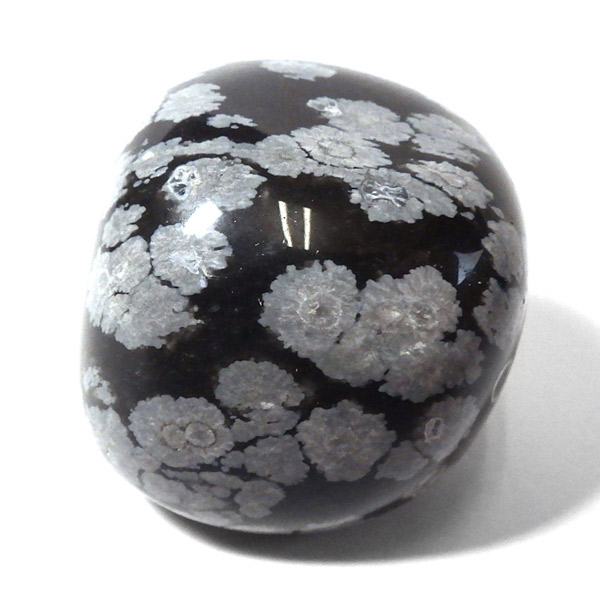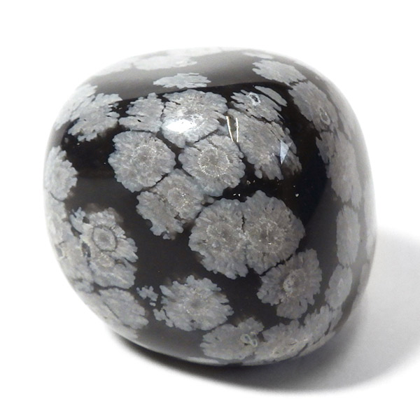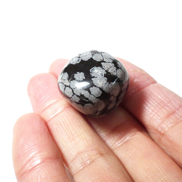 メキシコ産のスノーフレークオブシディアン、タンブルです。オブシディアンは、火山性の天然ガラスです。その中にクリストバライトという火山性鉱物が入り込んで、白い斑点模様を織り成しているのです。表面に雪の結晶のような模様が見えるのが特徴です。