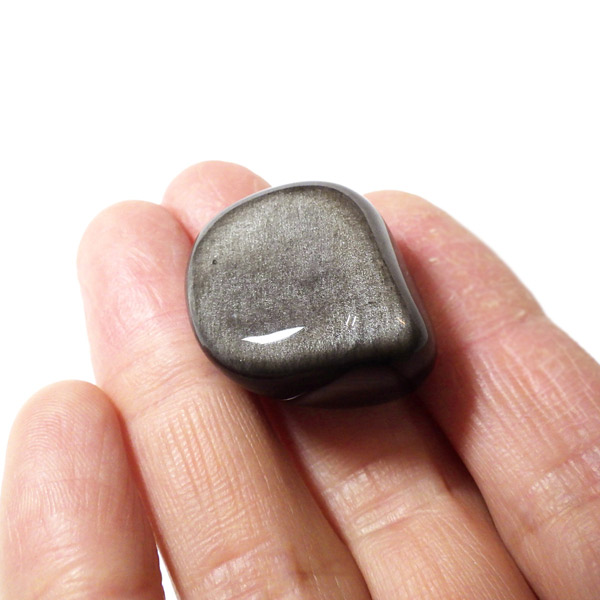 メキシコ産のシルバーオブシディアン、タンブルです。オブシディアンは和名で黒曜石。シルバーオブシディアンは黒曜石の中でもシルバーのシラー光沢を確認できる天然の火山ガラスです。シルバーオブシディアンはマグマが急速に冷却する際にナノ粒子が取り込まれ、その内包物によって引き起こされる光の干渉を持つ黒曜石のことです。角度によって現れるシルバーの輝きがシックでかっこいいです。