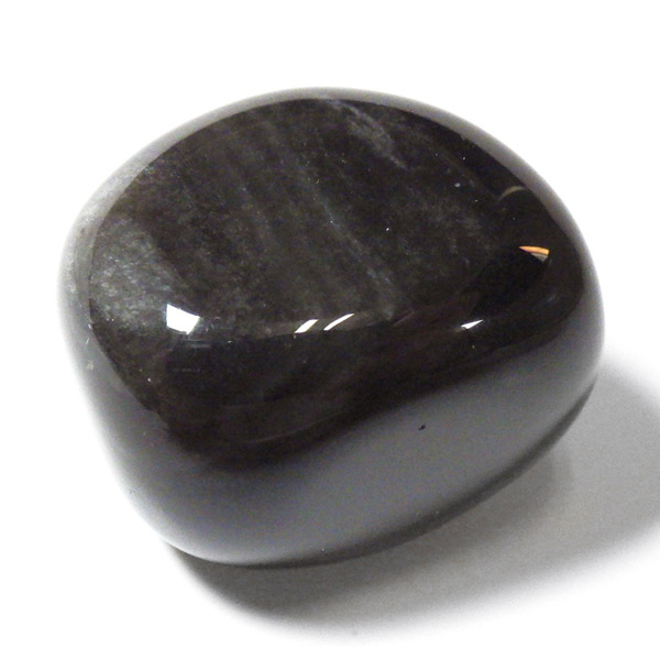メキシコ産のシルバーオブシディアン、タンブルです。オブシディアンは和名で黒曜石。シルバーオブシディアンは黒曜石の中でもシルバーのシラー光沢を確認できる天然の火山ガラスです。シルバーオブシディアンはマグマが急速に冷却する際にナノ粒子が取り込まれ、その内包物によって引き起こされる光の干渉を持つ黒曜石のことです。角度によって現れるシルバーの輝きがシックでかっこいいです。
