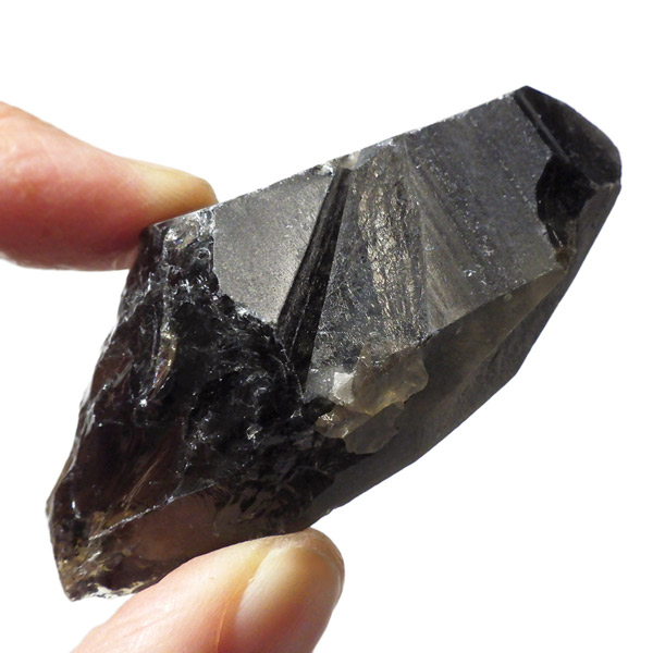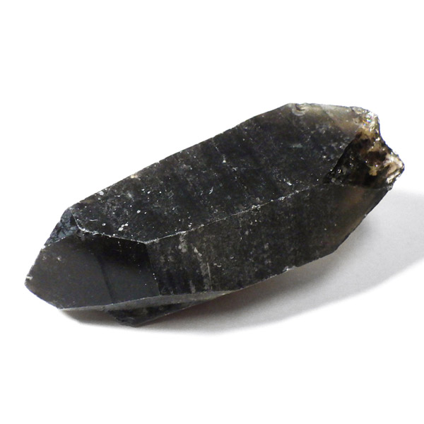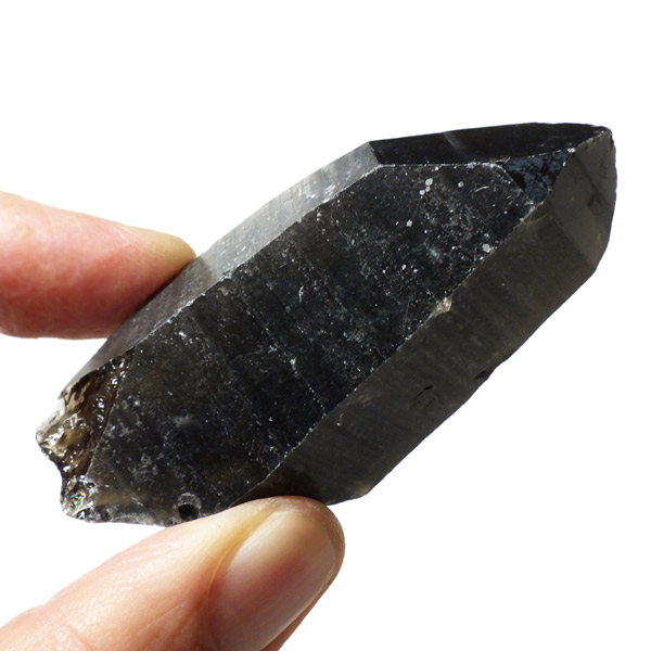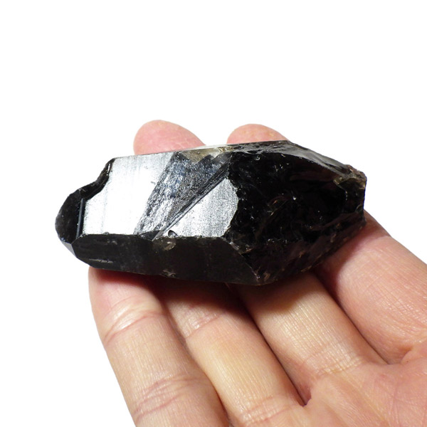内モンゴル産のモリオン原石ポイントです。 スモーキークォーツの中で、黒色が強く真っ黒な黒水晶をモリオンと呼びます。明確な境界の定義はありませんが、表面が黒光りするものをモリオンと呼んでいます。人によっては光を通すものをケアンゴームと呼ぶ場合もあります。モリオンは水晶の成長過程で微量のアルミニウムが放射性鉱物などの影響を受けると黒色に変色するといわれています。