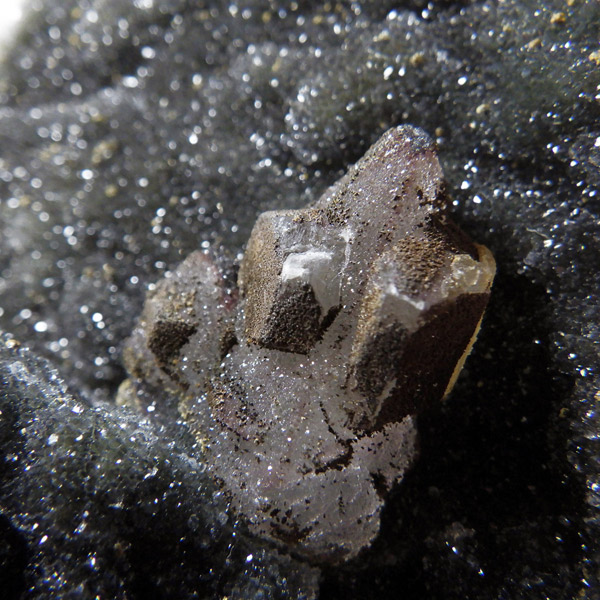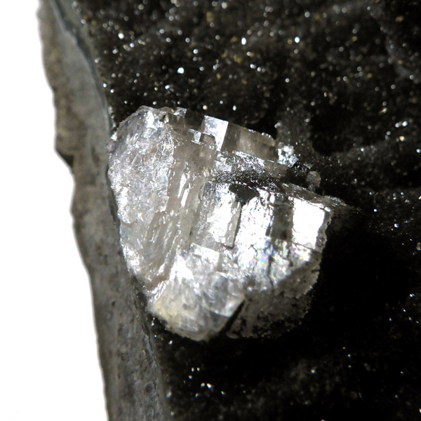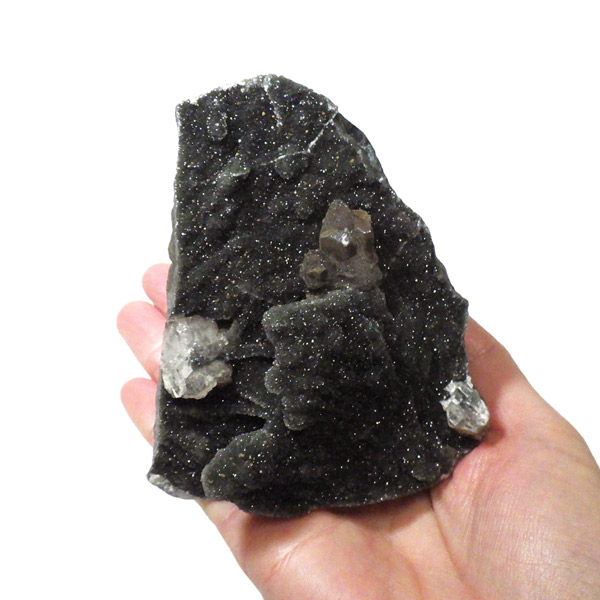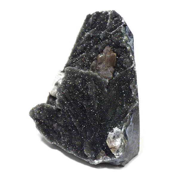 ウルグアイ産のブラックアメジストクラスターです。 アメジストが採れる鉱山で稀に黒色のアメジストが採れます。オーラ加工などではなく、ナチュラルな色付きの原石で、ブラックアメジストと呼ばれています。ブラックアメジストは流通名で、基本的にヘマタイトなど鉄分を含むクォーツ、又はカルセドニーです。紫が美しいアメジストではありませんが、細かな結晶はアメジスト以上に光をキラキラと反射させ、とても美しく煌めきます。こちらはアメジストでよく見られるようにカルサイトと共生しています。