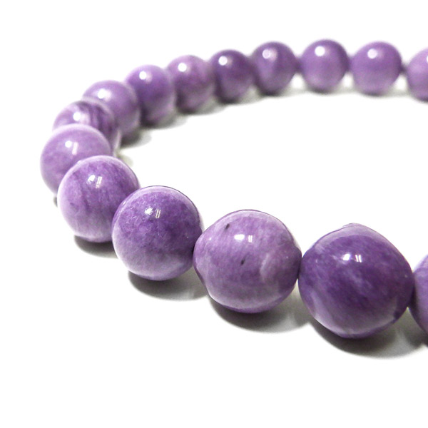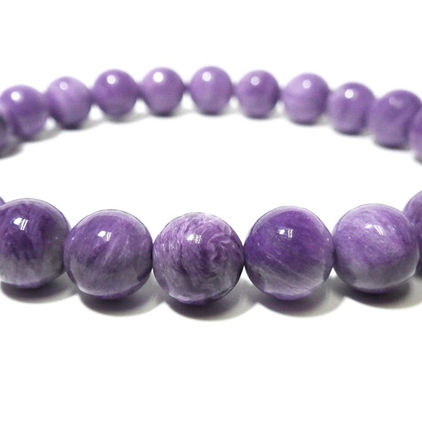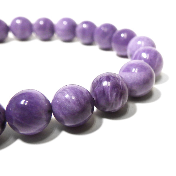 ロシア産、チャロアイトのブレスレットです。しっかりとした紫の発色が特徴的なお品です。深いパープルに美しいホワイトのマーブル模様が鮮やかに入っており、一層高級感を際立たせています。