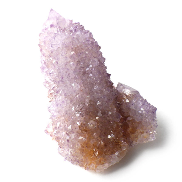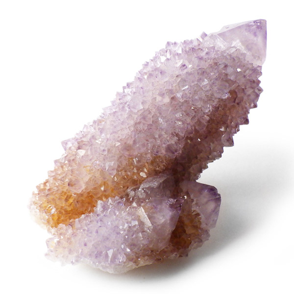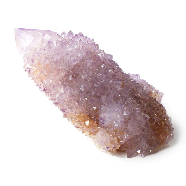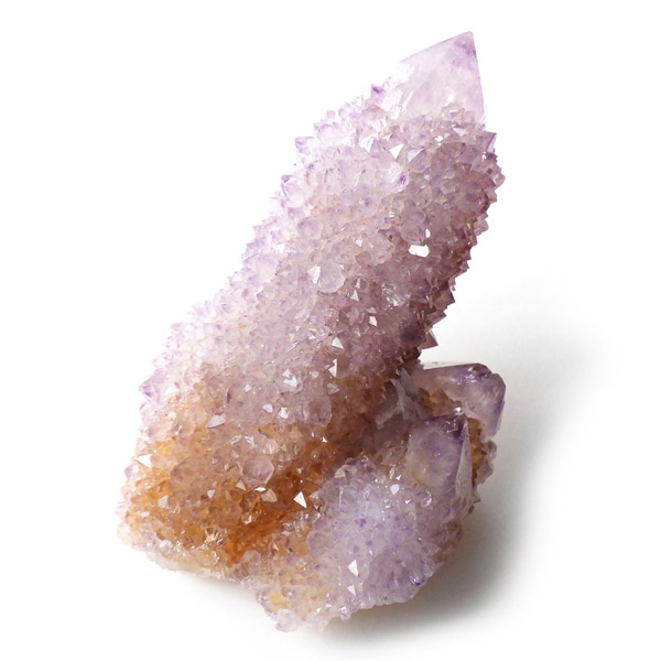南アフリカ産カクタスアメジスト原石です。カクタスアメジストは、細かな結晶に包まれるように、先端にポイントが伸びている特徴的なアメジストです。カクタスとは「サボテン」という意味で、見た目がサボテンに似ていることからこの名前がつけられ、サボテン水晶とも言われています。また、古来から精霊の宿る聖なる水晶とも崇められていて、スピリットクォーツとも言われています。細かな淡い結晶で形成されており、光を当てるとキラキラと神秘的な輝きを放ちます。表面の一部が黄色いリモナイト(褐鉄鉱)で覆われており、パープルとイエローのハーモニーが面白いです。