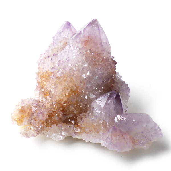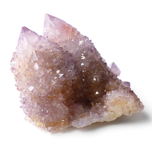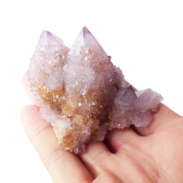 南アフリカ産カクタスアメジスト原石です。カクタスアメジストは、細かな結晶に包まれるように、先端にポイントが伸びている特徴的なアメジストです。カクタスとは「サボテン」という意味で、見た目がサボテンに似ていることからこの名前がつけられ、サボテン水晶とも言われています。また、古来から精霊の宿る聖なる水晶とも崇められていて、スピリットクォーツとも言われています。細かな淡い結晶で形成されており、光を当てるとキラキラと神秘的な輝きを放ちます。表面の一部が黄色いリモナイト(褐鉄鉱)で覆われており、パープルとイエローのハーモニーが面白いです。
