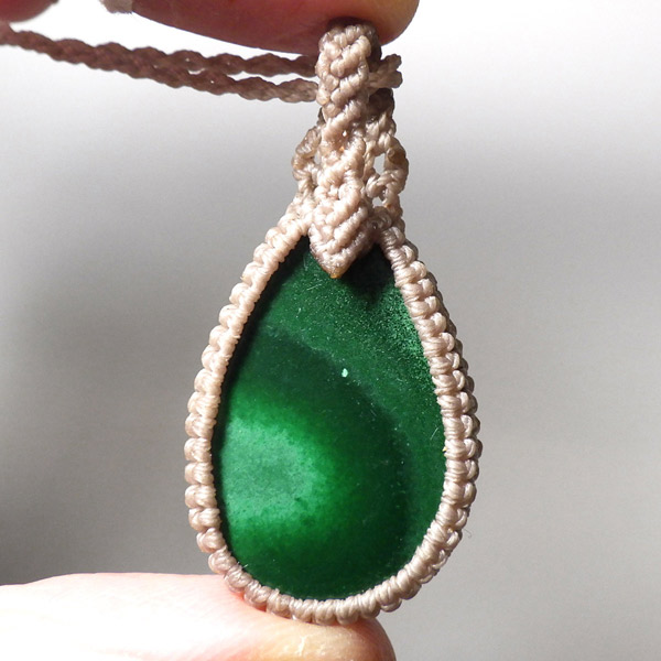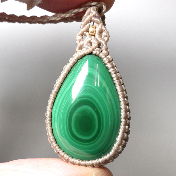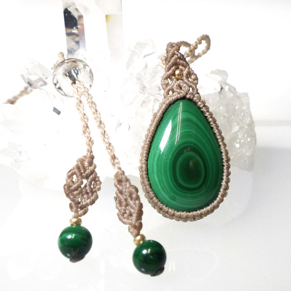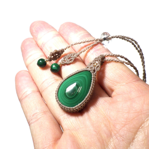 コンゴ産のマラカイトを使用したマクラメペンダントです。 孔雀の羽のようなきれいな模様のマラカイトを使用しました。発色の良いグリーンを優しい色合いの紐で包み込みました。危険や災いから持ち主の身を守る石として身に着けて頂ければと思います。