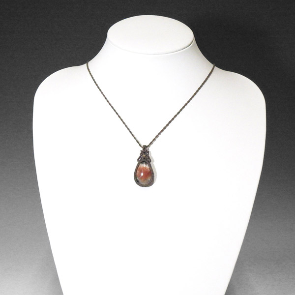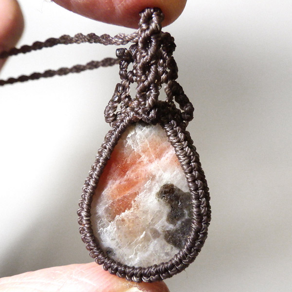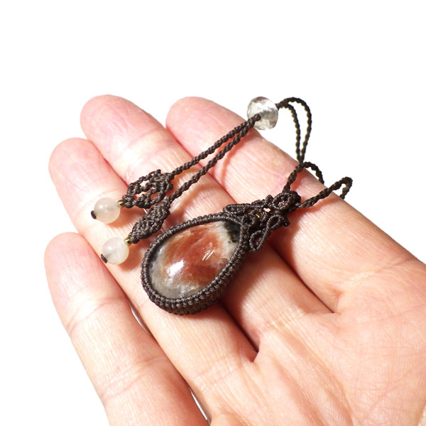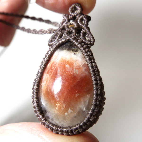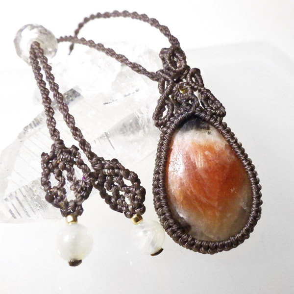 インド産のアイオライトサンストーンを使用したマクラメペンダントです。 ルースでは珍しいアイオライトサンストーンを使用しました。サンストーンを中心に共生鉱物の世界を楽しめます。エンド部分のビーズに白いムーンストーンを使い、シックに仕上げました。