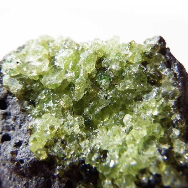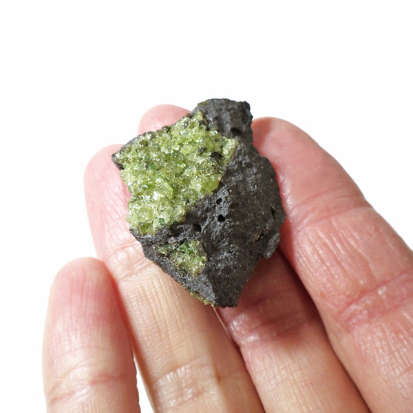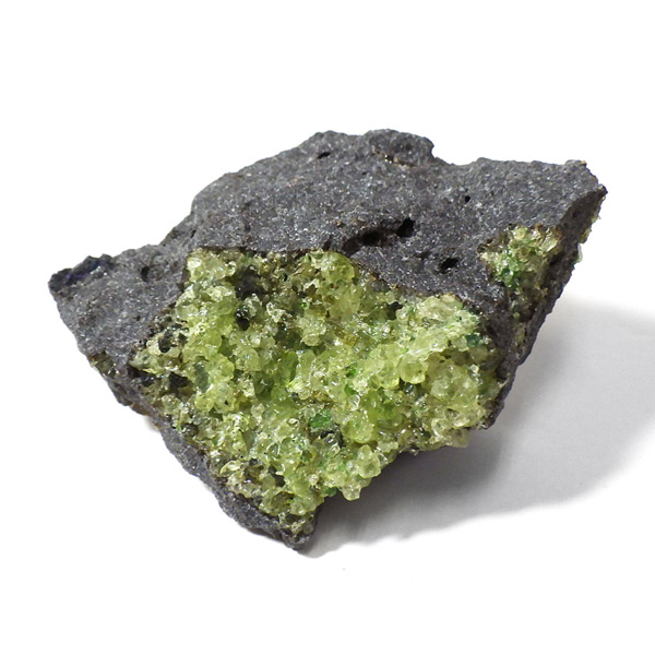 アメリカ・アリゾナ州産のペリドット母岩付き原石です。鉱物名をオリビンと呼ぶのですが、日本では宝石名のペリドットが浸透しています。和名は橄欖(かんらん)石といいます。主にグリーンの結晶がかんらん石でグレーの母岩が玄武岩です。かんらん石は月の岩石や石質隕石、石鉄隕石にも含まれており、鉄の含有量によって、白色から黒色まで色調が変化します。かんらん石は地球の上部マントルの主要構成鉱物でマグマの噴火によって溶岩の塊に運ばれて地表に出てきます。まさにその姿を切り取ったようなこの原石は、様々な濃淡の結晶が多面にわたり観察できます。