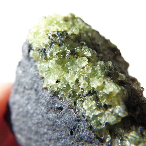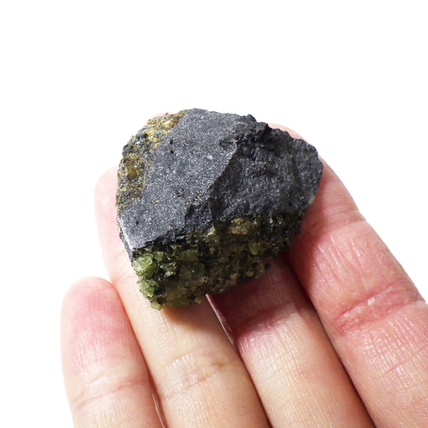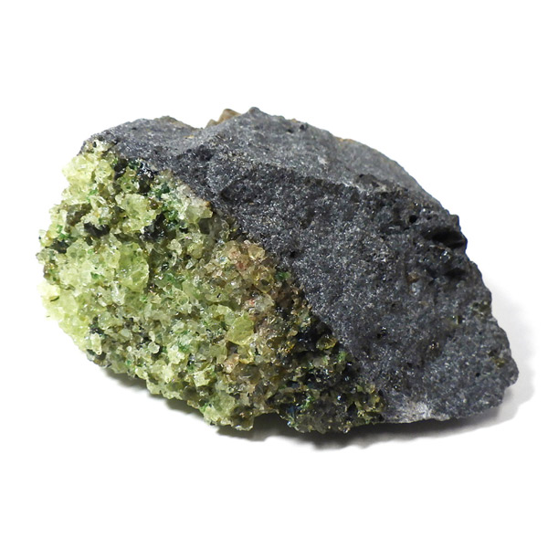 アメリカ・アリゾナ州産のペリドット母岩付き原石です。鉱物名をオリビンと呼ぶのですが、日本では宝石名のペリドットが浸透しています。和名は橄欖(かんらん)石といいます。主にグリーンの結晶がかんらん石でグレーの母岩が玄武岩です。かんらん石は月の岩石や石質隕石、石鉄隕石にも含まれており、鉄の含有量によって、白色から黒色まで色調が変化します。かんらん石は地球の上部マントルの主要構成鉱物でマグマの噴火によって溶岩の塊に運ばれて地表に出てきます。まさにその姿を切り取ったようなこの原石は、様々な濃淡の結晶が多面にわたり観察できます。