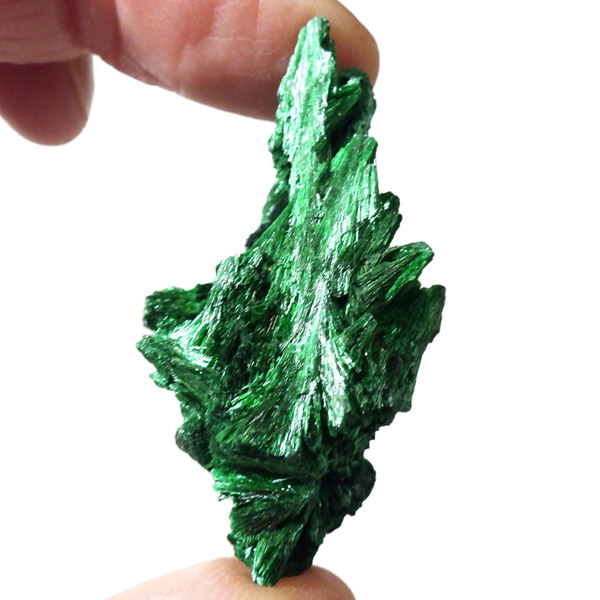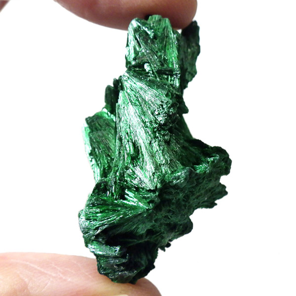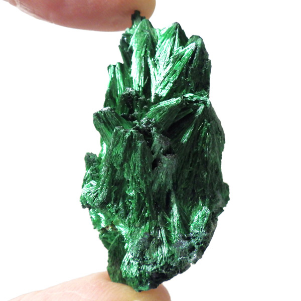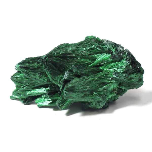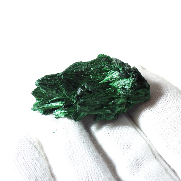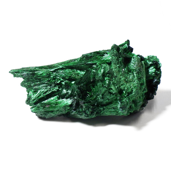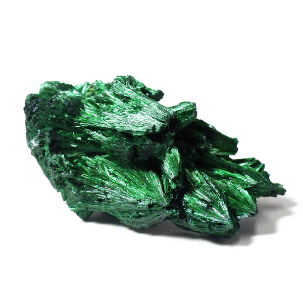 コンゴ産のマラカイト原石です。繊維状の結晶が集まった美しい一品で、ベルベットのような光沢があります。艶やかに光るきれいなグリーンで、一見脆そうに見えますが触ってみるとしっかりした結晶です。照り・艶・色味がトップクラスに美しいマラカイトの結晶になっております。