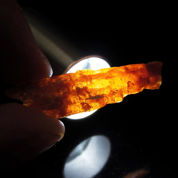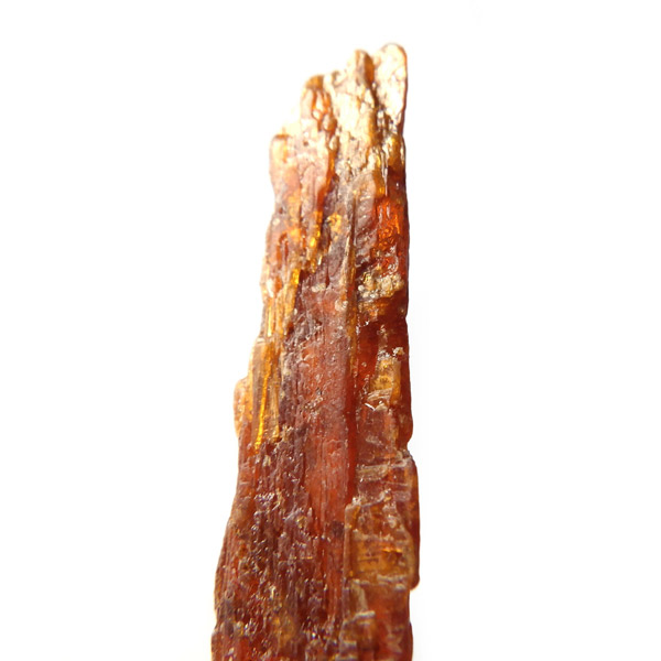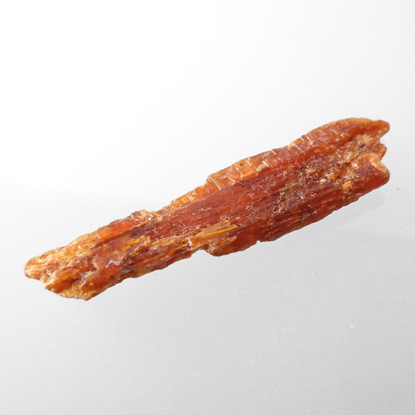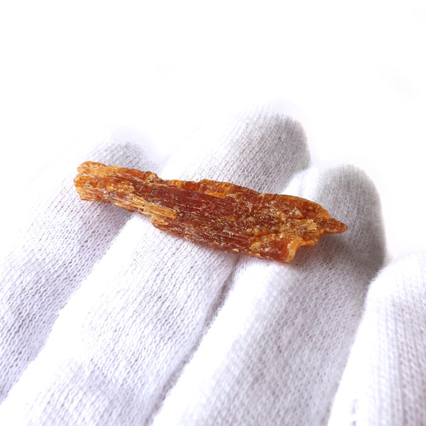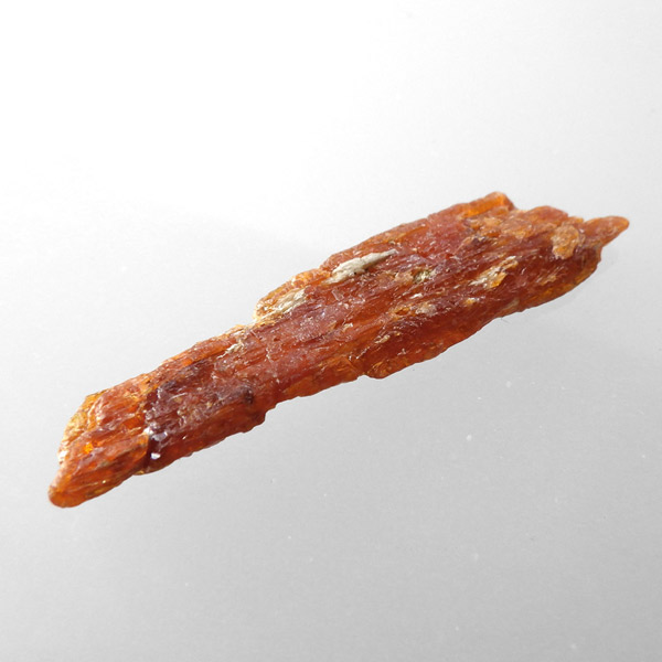 タンザニア産、オレンジカイヤナイト結晶原石です。カイヤナイトといえば、ブルーがよく知られており、他にはグリーンがたまに見かける程度でした。オレンジカイヤナイトは2007年にタンザニアで発見され 、2009年のツーソンショーで初めて現れ注目されたレア宝石です。鋭く縦に伸びる結晶と表面の光沢は、ブルー同様カイヤナイトの特徴としてオレンジカイヤナイトでも見られます。光も透過し、美しい姿を見せてくれます。
