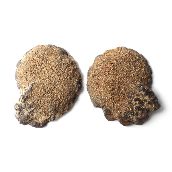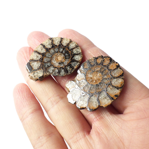 モロッコ産、アンモナイトの化石ペアです。アンモナイトの化石を中央で切断したアイテムで、化石の内部断面が見られてとても興味深いです。メタリックな光沢はアンモナイトの空洞部分にヘマタイトが流れ込んで一体化したものと思われ、化石として形も綺麗で映えますね。