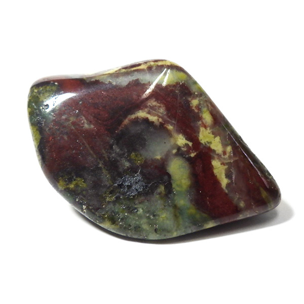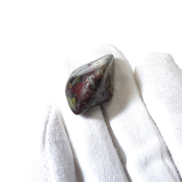 現在では南アフリカまたはオーストラリアで産出される石のようです。ドラゴンストーンまたはドラゴンブラッドジャスパーと呼ばれます。これは、ドラゴンの皮膚を思わせる緑色に、ドラゴンの血をイメージさせる赤い点や筋が入っていることから名付けられています。日本ではあまり文献がないのですが基本はジャスパーだと思われます。こちらは磨いたタンブルですが、原石の状態ですとドラゴン模様の緑の石に本当にドラゴンの血が付いたのではと思わせられます。見た目は綺麗というよりは力強くかっこいい石です。