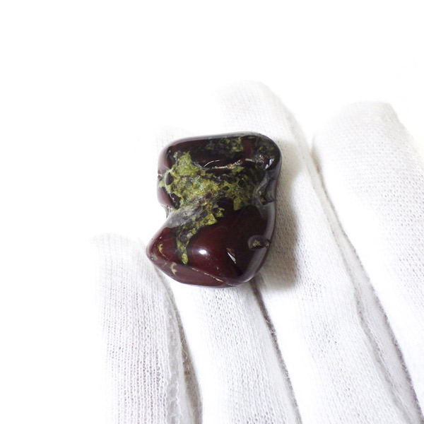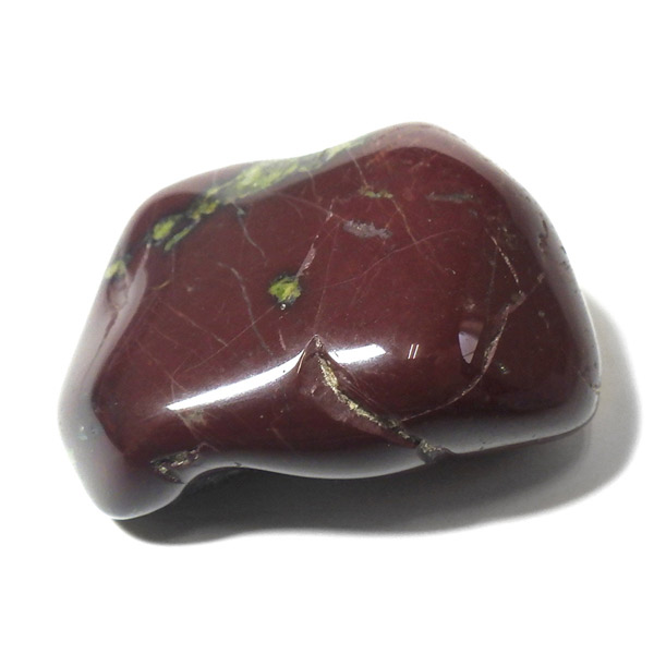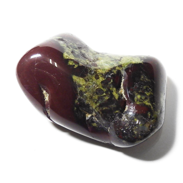 現在では南アフリカまたはオーストラリアで産出される石のようです。ドラゴンストーンまたはドラゴンブラッドジャスパーと呼ばれます。これは、ドラゴンの皮膚を思わせる緑色に、ドラゴンの血をイメージさせる赤い点や筋が入っていることから名付けられています。日本ではあまり文献がないのですが基本はジャスパーだと思われます。こちらは磨いたタンブルですが、原石の状態ですとドラゴン模様の緑の石に本当にドラゴンの血が付いたのではと思わせられます。見た目は綺麗というよりは力強くかっこいい石です。