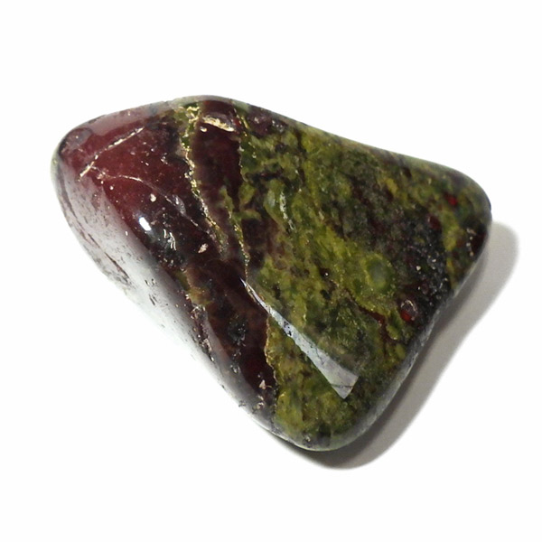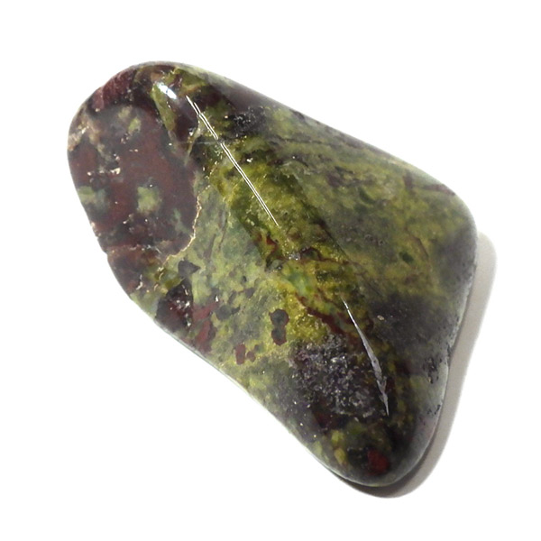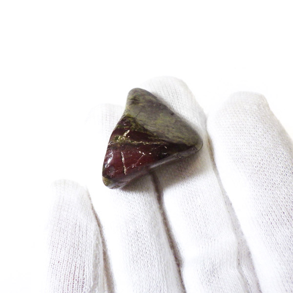 現在では南アフリカまたはオーストラリアで産出される石のようです。ドラゴンストーンまたはドラゴンブラッドジャスパーと呼ばれます。これは、ドラゴンの皮膚を思わせる緑色に、ドラゴンの血をイメージさせる赤い点や筋が入っていることから名付けられています。日本ではあまり文献がないのですが基本はジャスパーだと思われます。こちらは磨いたタンブルですが、原石の状態ですとドラゴン模様の緑の石に本当にドラゴンの血が付いたのではと思わせられます。見た目は綺麗というよりは力強くかっこいい石です。
