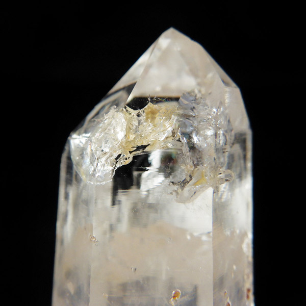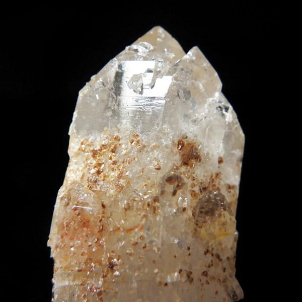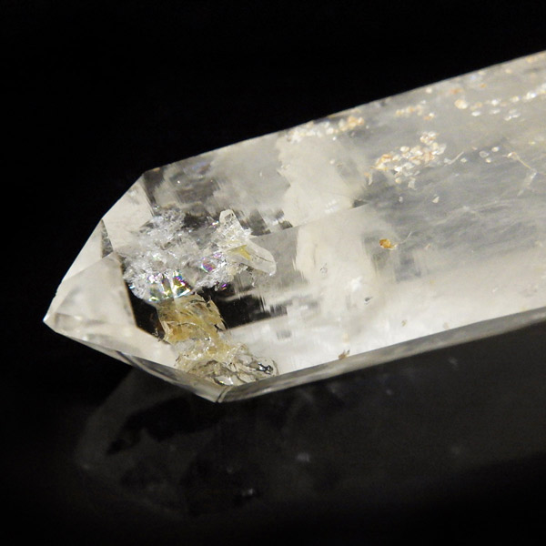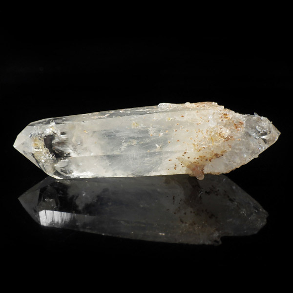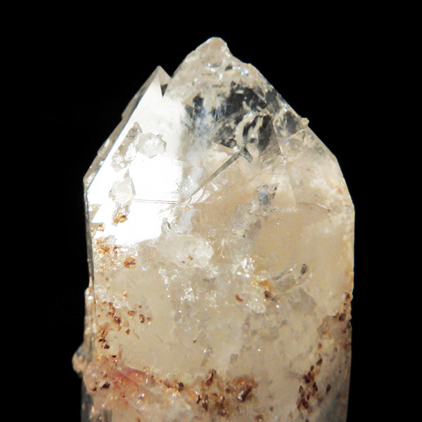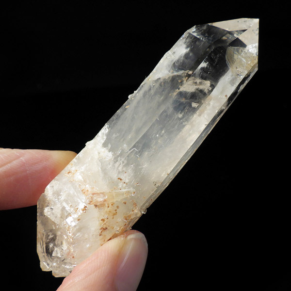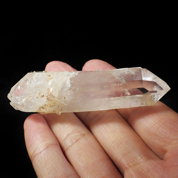 チタニウムインクォーツとは、水晶内部の空洞の中にチタニウムを含むガスが入り込み、霧のようなインクルージョンになっているものです。一見クリアな水晶ですが、水晶内部をよく見ると白い霧や吐息のような青みがかったインクルージョンが見られ、とても神秘的です。別名エンジェルブレッシングクォーツとも呼ばれています。先端の透明度は非常に高く、表面は艶があり、水晶クリスタルとしても非常に品質が高いです。こちらの水晶はセルフヒールドで両剣水晶になっています。また表面に細かな水晶が共生しています。