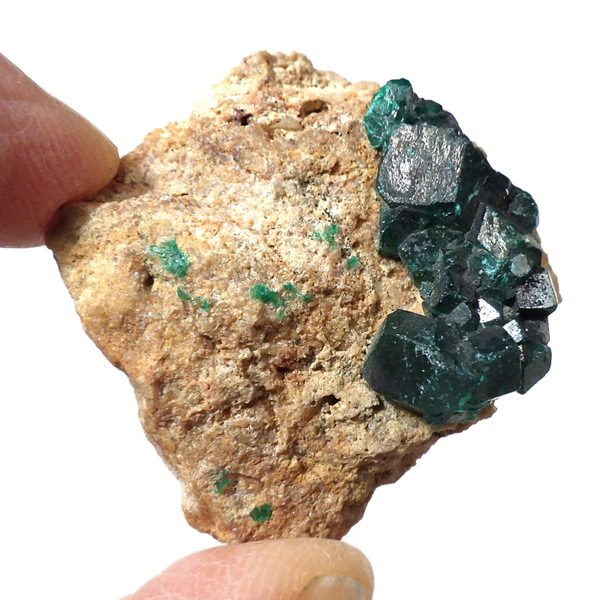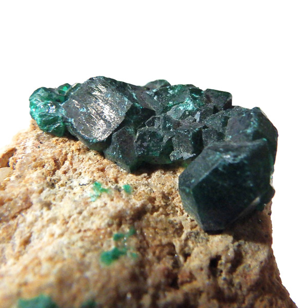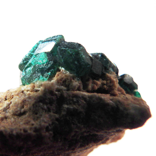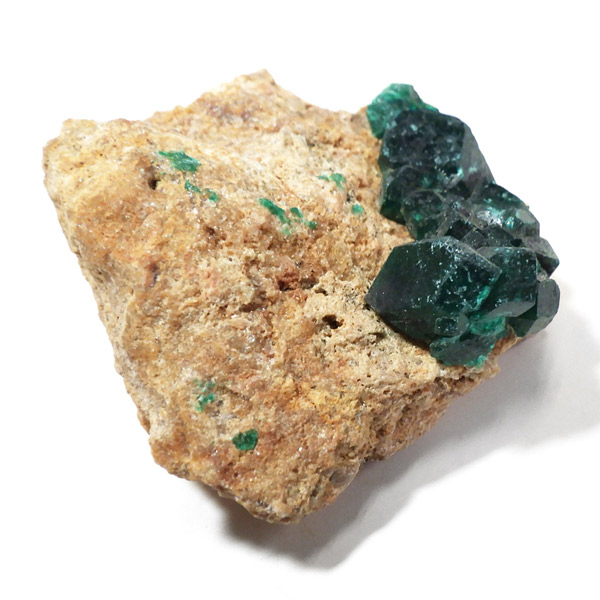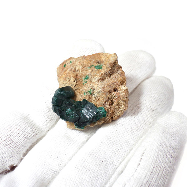 コンゴ産のダイオプテーズ原石です。ダイオプテーズは、美しい翠緑色が魅力的な石で、和名は「翠銅鉱」と言います。1785年に最初にカザフスタンで発見され、とても深く鮮やかなグリーンが特徴で、当時はエメラルドと間違われました。その後、エメラルドと成分が異なることが確認され、ダイオプテーズと名づけられました。銅にまつわる副産物で、ダイオプテーズそのものでも希少性が高く、高価な鉱物です。