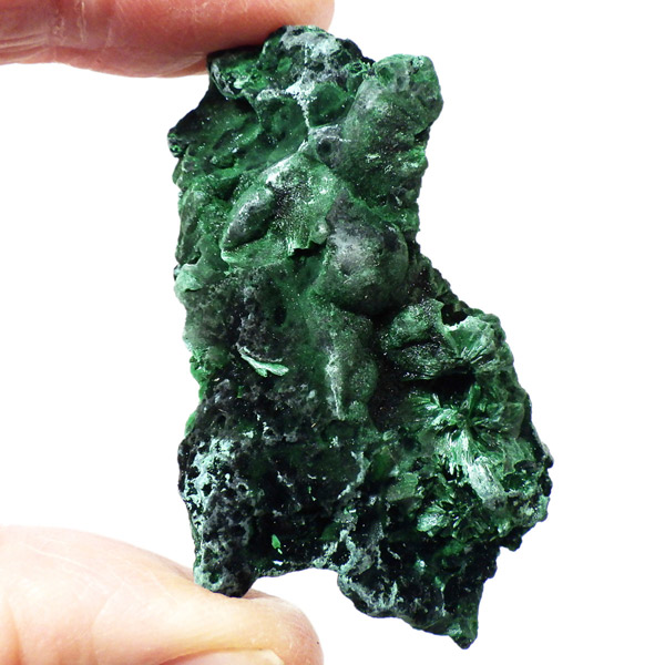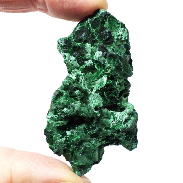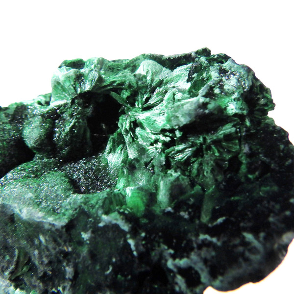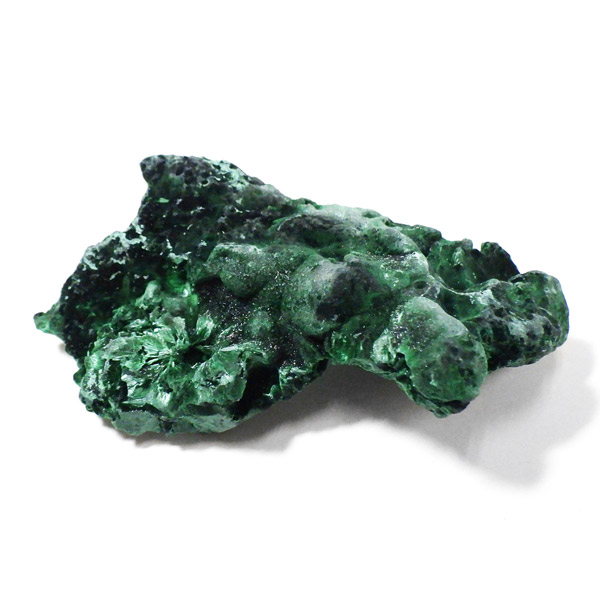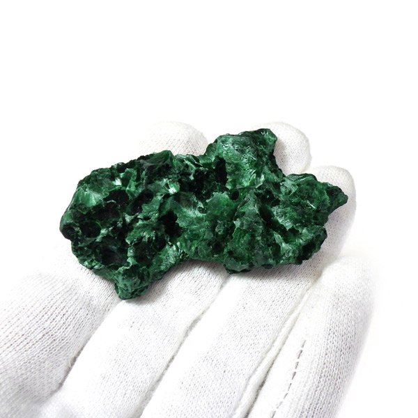 コンゴ産のマラカイト原石です。繊維状の結晶が扇状に集まった美しい一品で、ベルベットのような光沢があります。艶やかに光るきれいなグリーンで、一見脆そうに見えますが触ってみるとしっかりした結晶です。