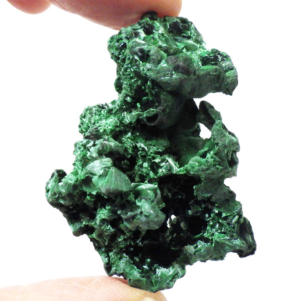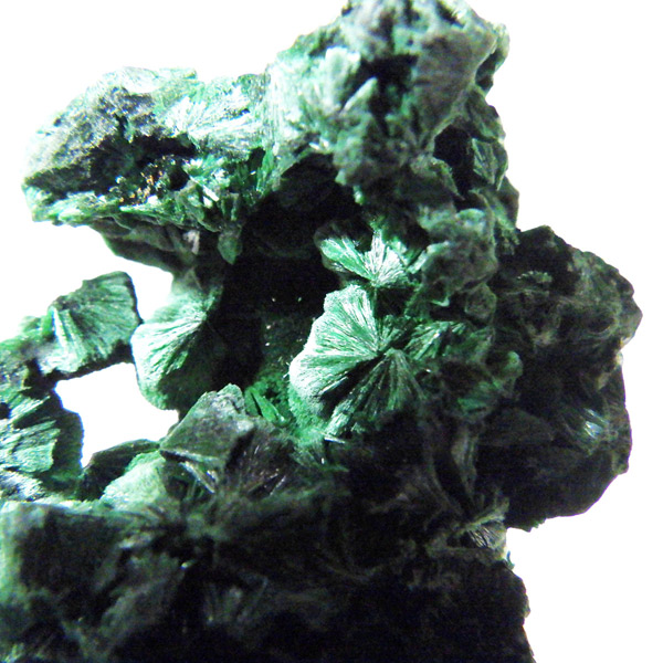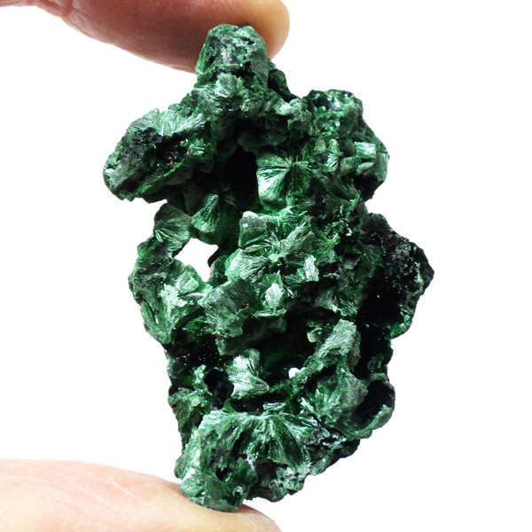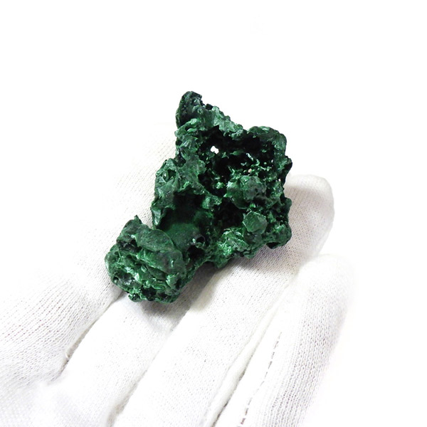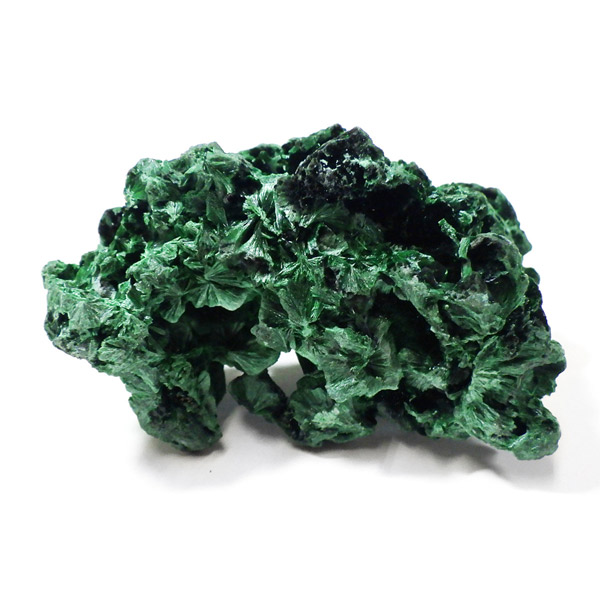 コンゴ産のマラカイト原石です。繊維状の結晶が扇状に集まった美しい一品で、ベルベットのような光沢があります。艶やかに光るきれいなグリーンで、一見脆そうに見えますが触ってみるとしっかりした結晶です。