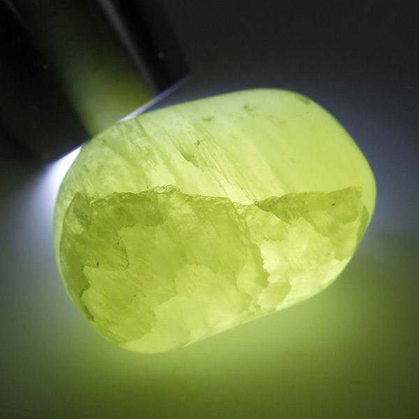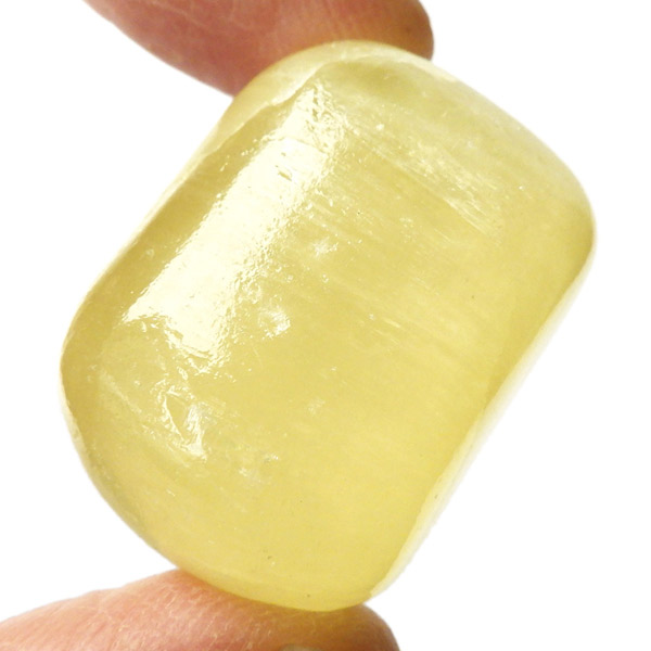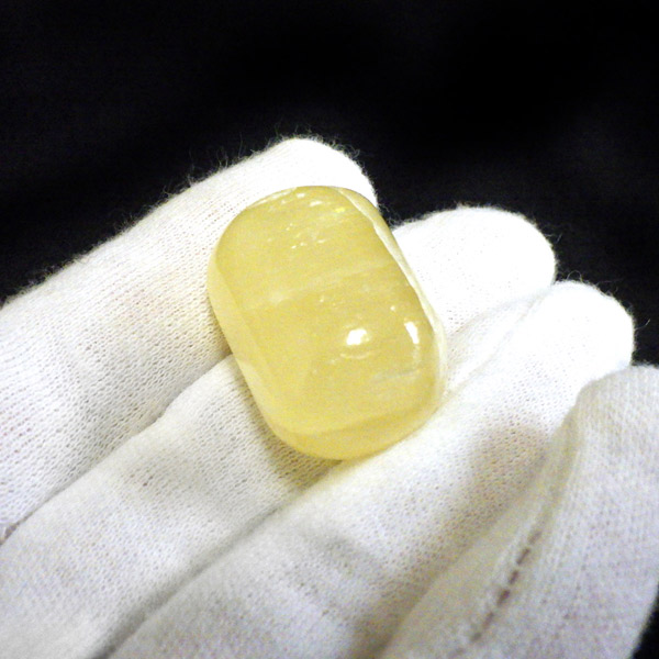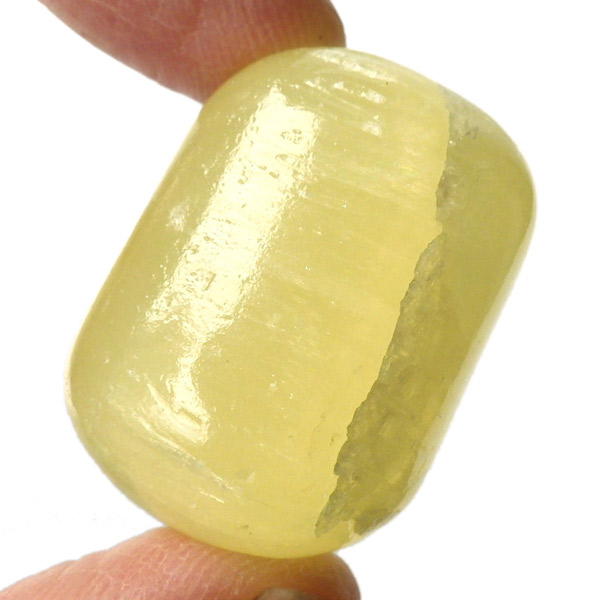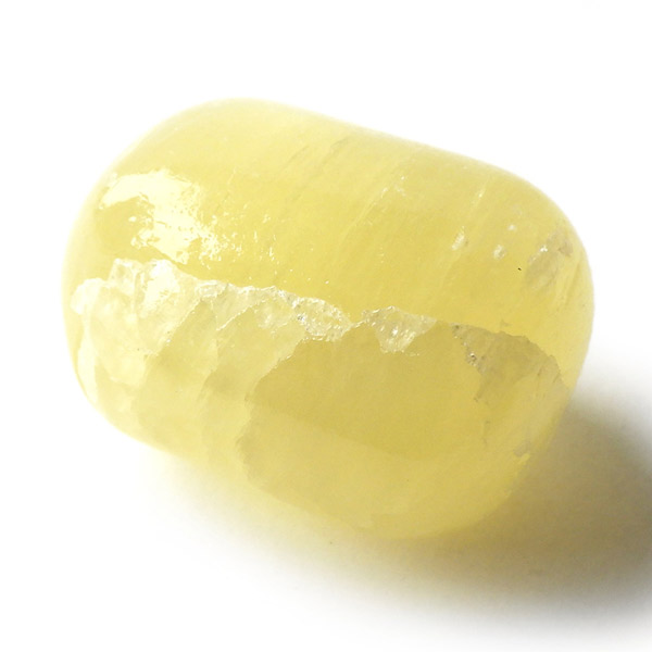 アフガニスタン産、イエローカルサイトのタンブルです。カルサイトはイエロー以外にもグリーン、ピンク、オレンジ、ブルーなどと含まれる成分により様々なカラーバリエーションがあります。純粋なカルサイトは無色ですが、鉄分が含まれることで黄色になります。その見た目からパイナップルカルサイトとも呼ばれています。オレンジでもグリーンでもない、パイナップルカラーのイエローと白い筋がまさパイナップルの果肉にそっくりですね。フラッシュライトなどで光を通してもきれいです。