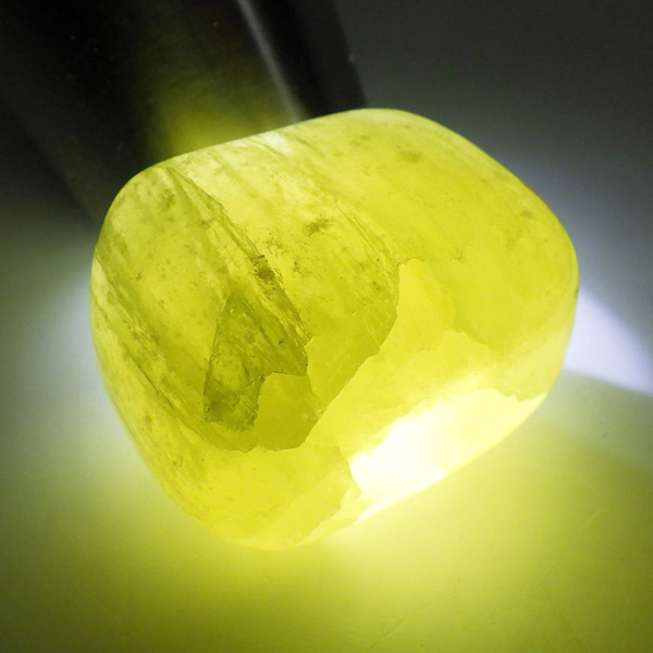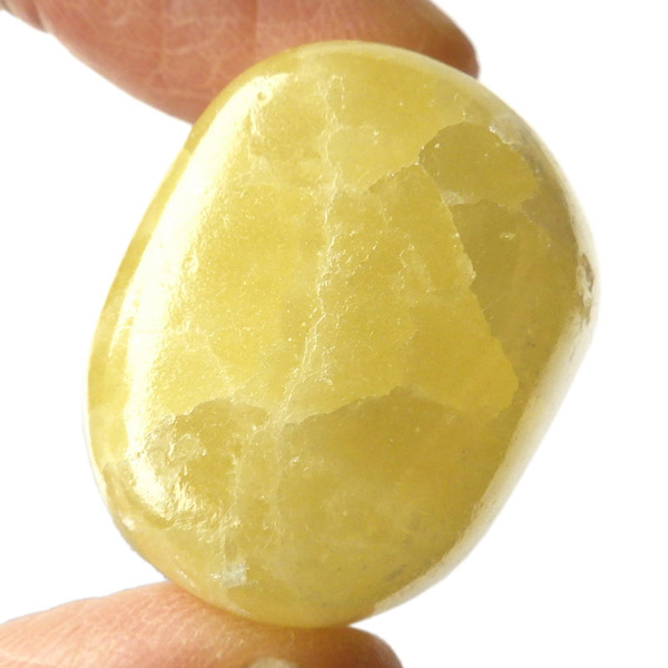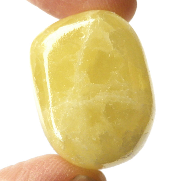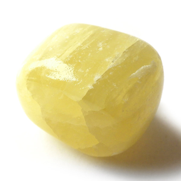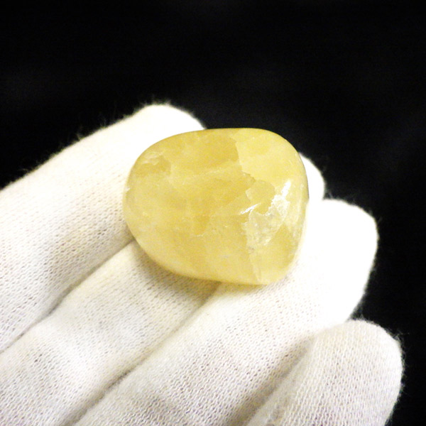 アフガニスタン産、イエローカルサイトのタンブルです。カルサイトはイエロー以外にもグリーン、ピンク、オレンジ、ブルーなどと含まれる成分により様々なカラーバリエーションがあります。純粋なカルサイトは無色ですが、鉄分が含まれることで黄色になります。その見た目からパイナップルカルサイトとも呼ばれています。オレンジでもグリーンでもない、パイナップルカラーのイエローと白い筋がまさパイナップルの果肉にそっくりですね。フラッシュライトなどで光を通してもきれいです。