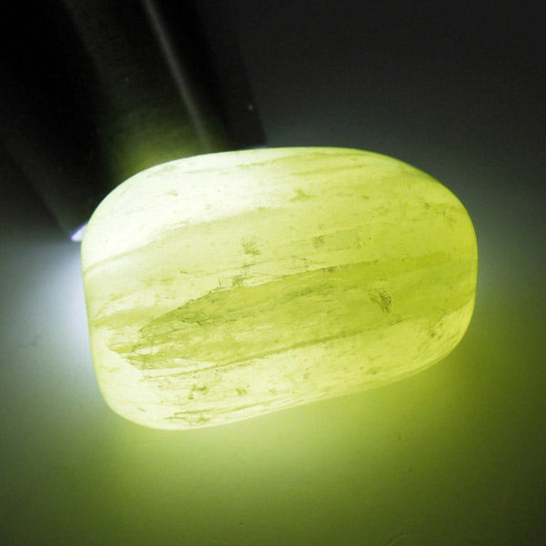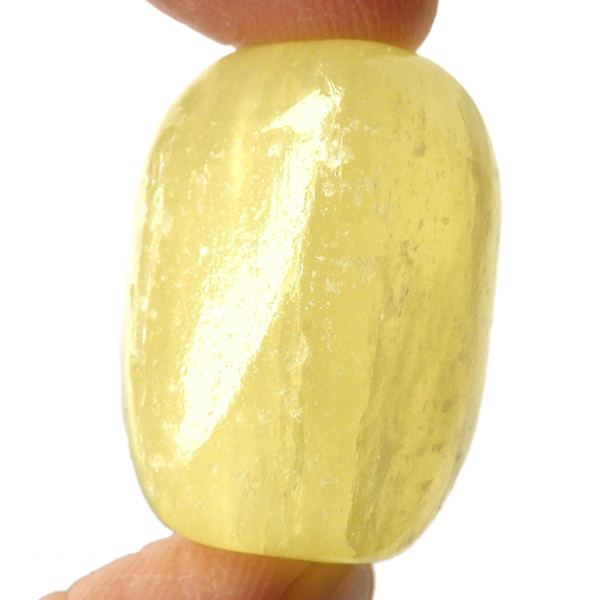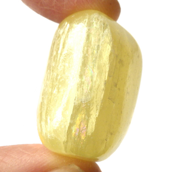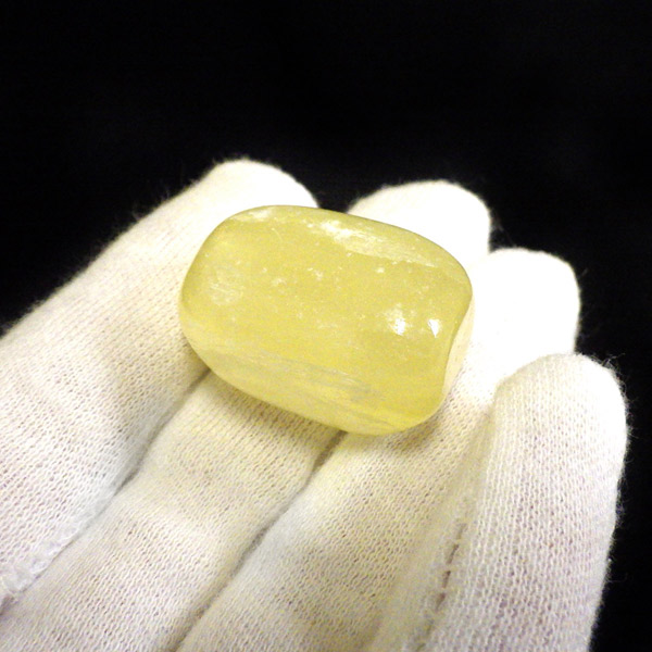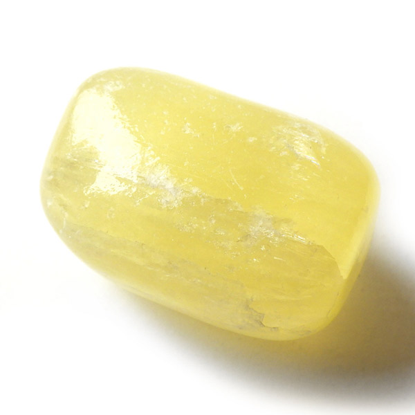 アフガニスタン産、イエローカルサイトのタンブルです。カルサイトはイエロー以外にもグリーン、ピンク、オレンジ、ブルーなどと含まれる成分により様々なカラーバリエーションがあります。純粋なカルサイトは無色ですが、鉄分が含まれることで黄色になります。その見た目からパイナップルカルサイトとも呼ばれています。オレンジでもグリーンでもない、パイナップルカラーのイエローと白い筋がまさパイナップルの果肉にそっくりですね。フラッシュライトなどで光を通してもきれいです。