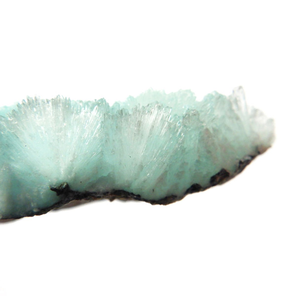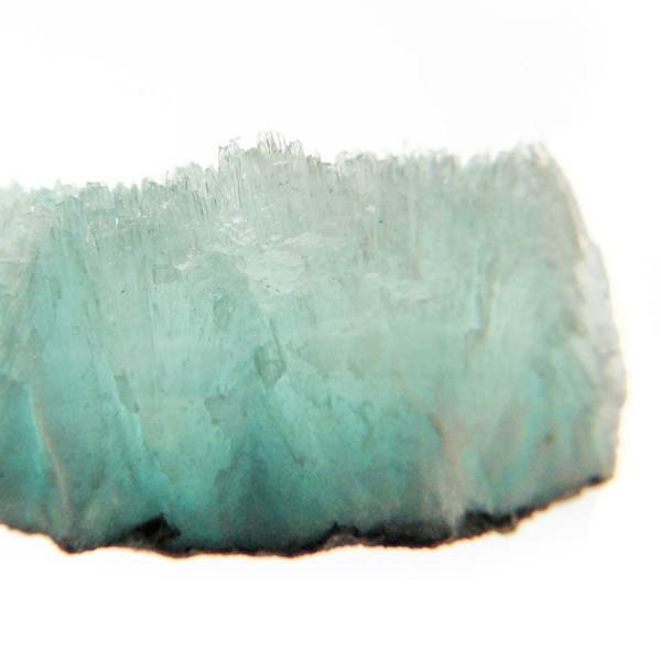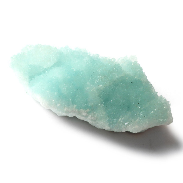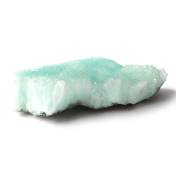 チャイナ産のブルーアラゴナイト原石です。アラゴナイトといえば、塊状で産出される黄色の原石がビーズなどに加工されていますが、青色のブルーアラゴナイトは流通量が少なくレアな石とされています。まるで氷の世界のような結晶で、きれいなアイスブルーとホワイトの発色をしています。側面の結晶も面白く、濁りもなく品質も良い一点です。