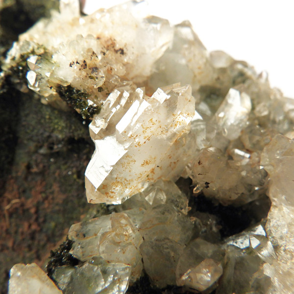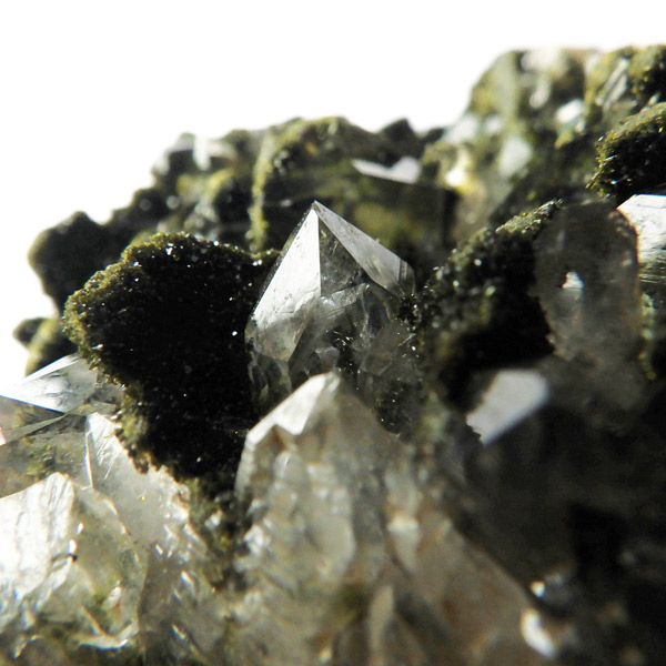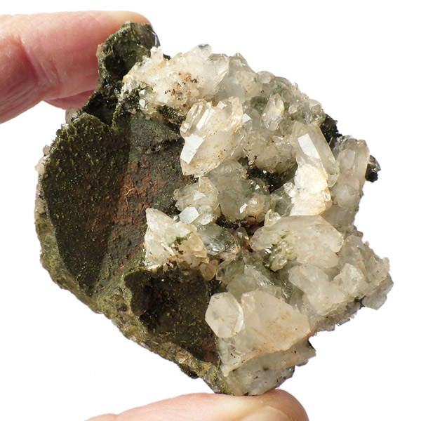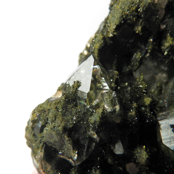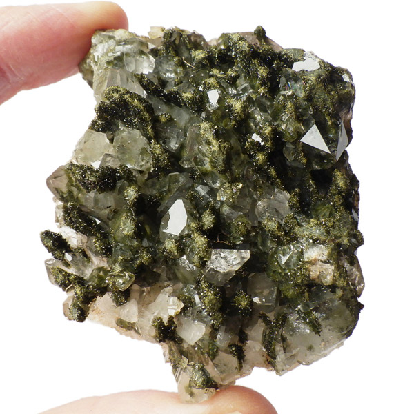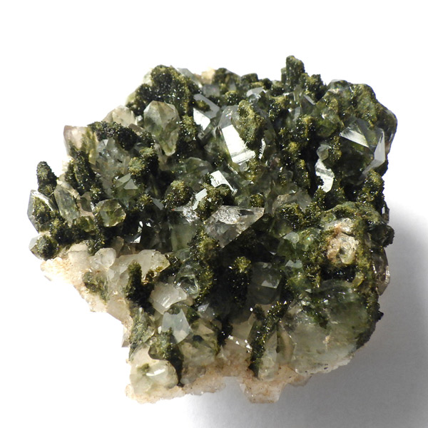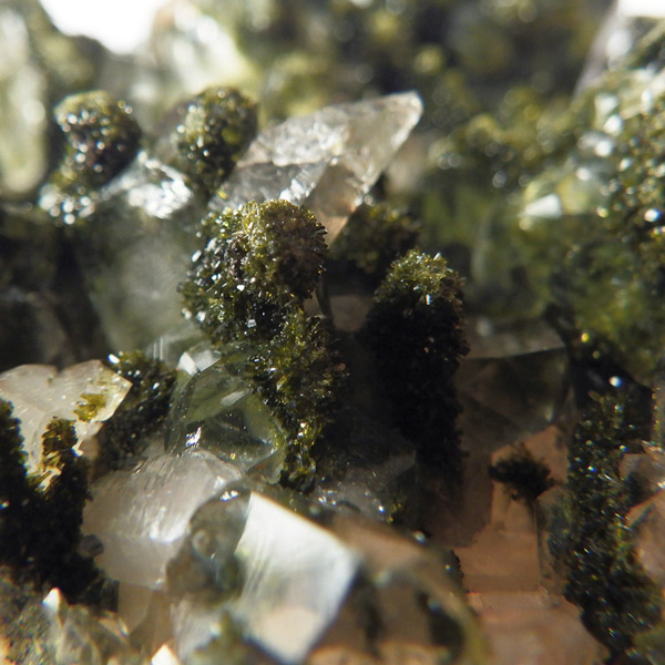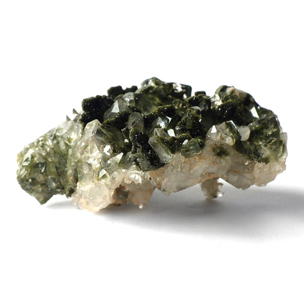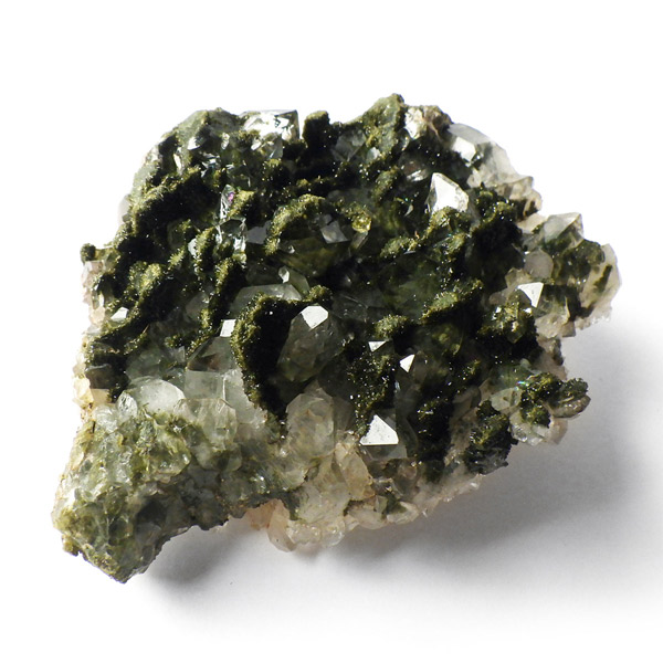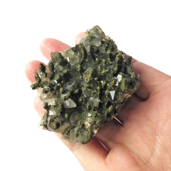 トルコ産のエピドート原石です。和名は緑簾石。緑色の結晶に線が入っている様子が簾に見えることから名付けられています。細かなエピドートの結晶が水晶の合間からキラキラと輝いています。クォーツの上に乗っかって結晶しているものが多く、一部内包しているものも見られます。