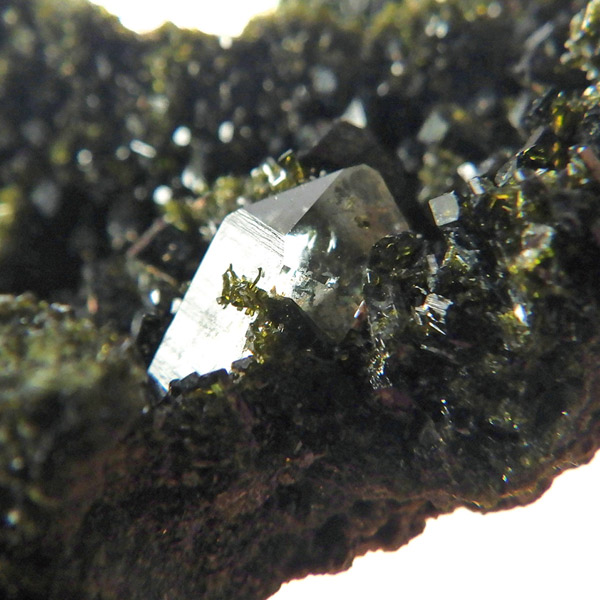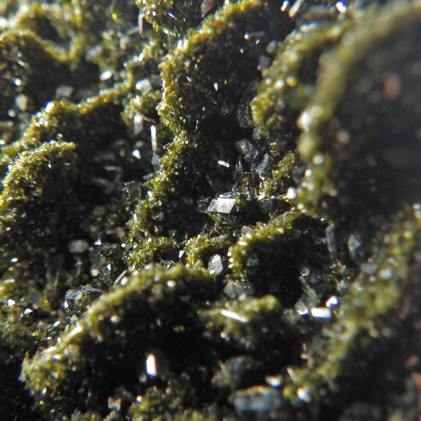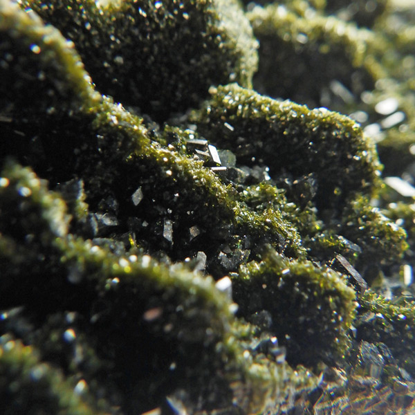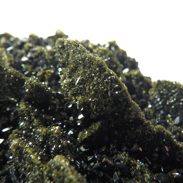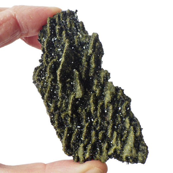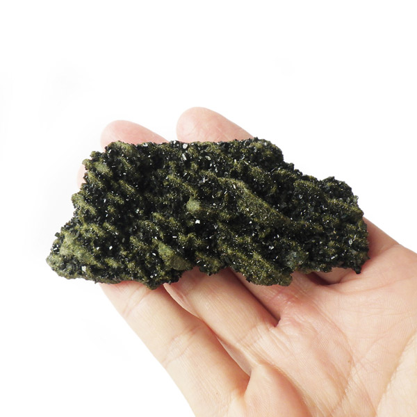 トルコ産のエピドート原石です。和名は緑簾石。緑色の結晶に線が入っている様子が簾に見えることから名付けられています。細かなエピドートの結晶がキラキラと輝いており、まるで森の奥地のような結晶をしています。