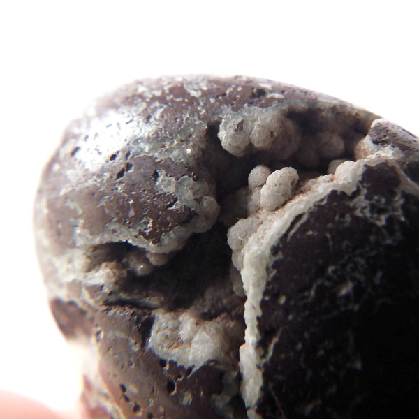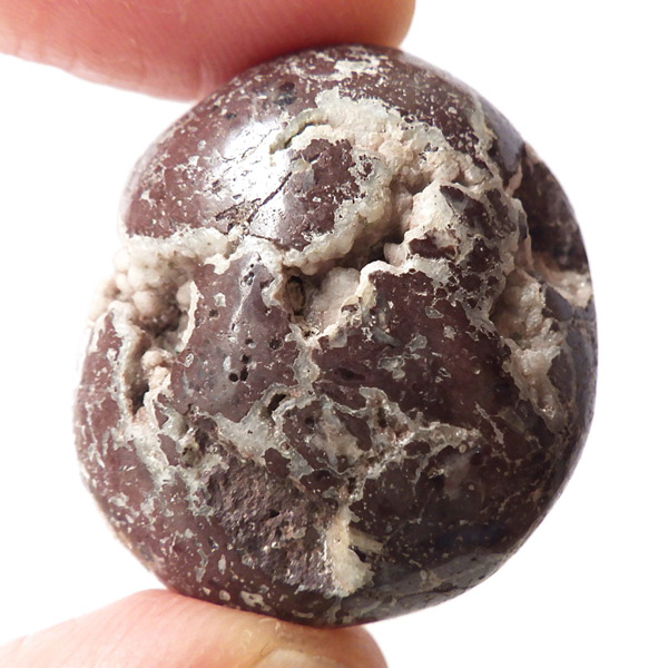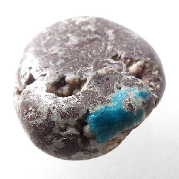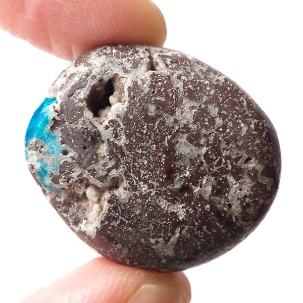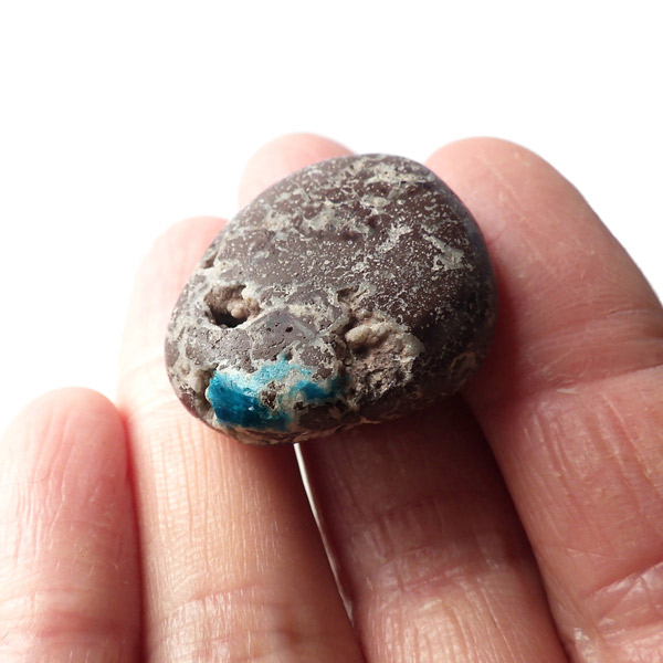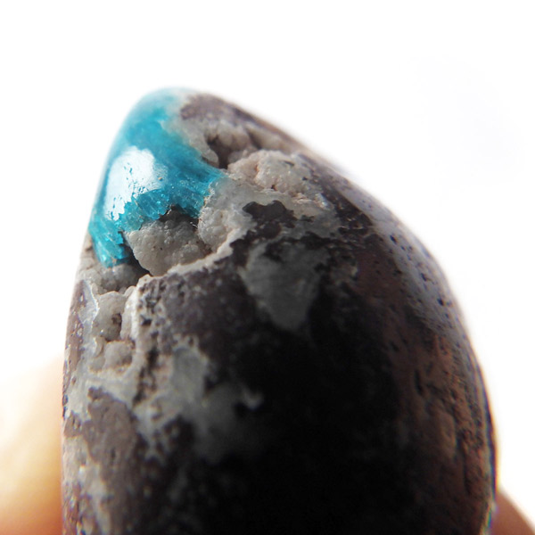 インド産のカバンサイト、タンブルです。 カバンサイトは、沸石の中でも人気を誇る、美しいビビッドな青い発色が魅力です。主成分の、「カルシウム」「バナジウム」「シリコン」の3つの頭文字をつなげて「カバンサイト」と付けられたのが名前の由来です。 1973年にアメリカで発見された、まだ歴史の浅い石で、発見されたのはアメリカですが、現在ではまずアメリカでは採れず、インドで採掘が続けられています。 本来 カバンサイトは、沸石に属し、モース硬度が低い上に、ボンボリ状の形状から加工には不向きなミネラルとして知られています。そのため、ルースやタンブルに加工することは非常に難しいのですが、今回ご用意した商品は、母岩共々加工する事で、ようやくタンブルとしてご案内できる超レアなものとなります。