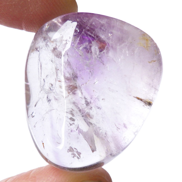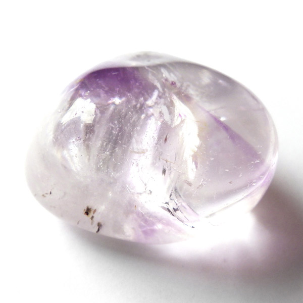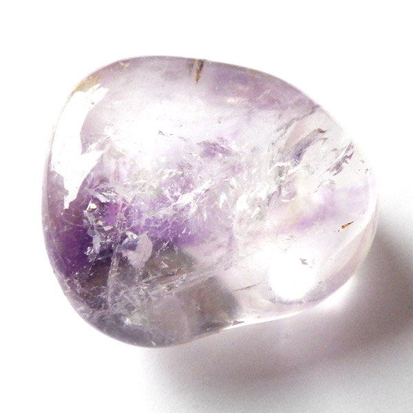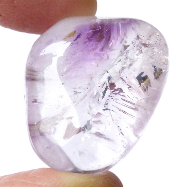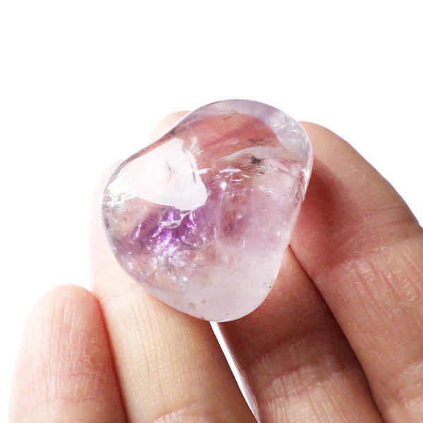ブラジル産アメジストエレスチャル、タンブルです。エレスチャルは、水晶グループの中でも特に長い時間をかけて、特殊な成長過程を経て形成されたもののことを指し、「水晶の最終形態」とも言われています。エレスチャルの中でも、水晶の中にアメジスト部分が多く入っているものをアメジストエレスチャルと呼びます。非常に美しいインクルージョンでレインボーも確認できました。光に透かすと美しく、やっぱりいいなと見惚れてしまいます。透明度が高く紫色も濃いものは、なかなか手に入らないのでおすすめです。