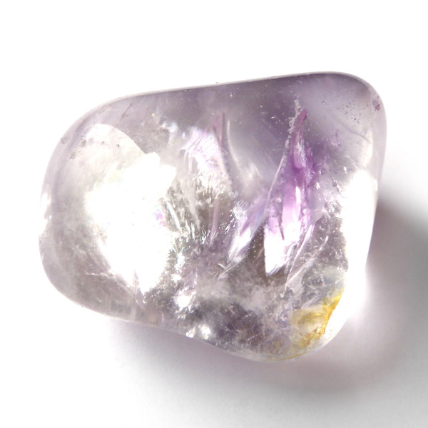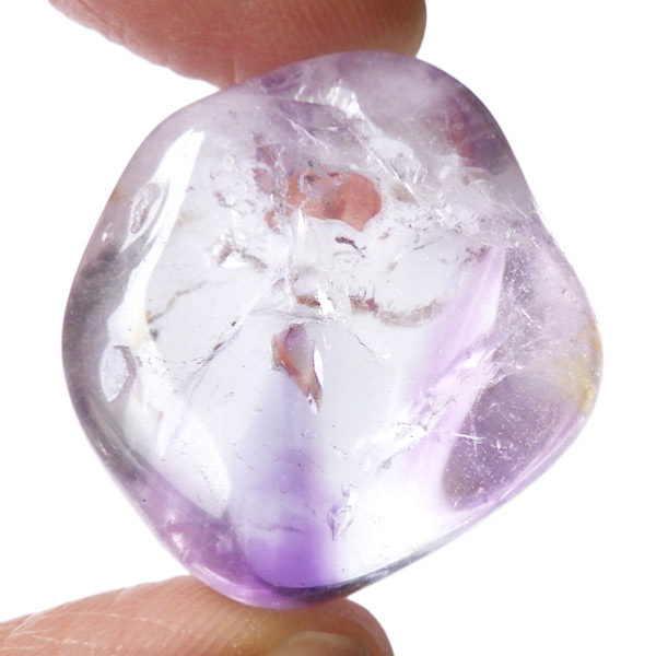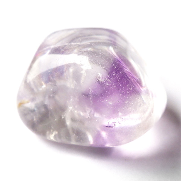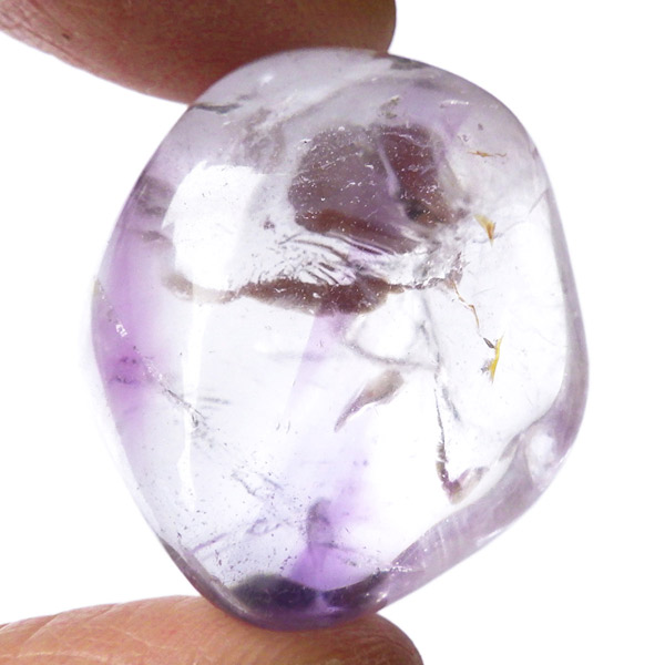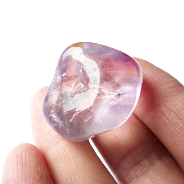 ブラジル産アメジストエレスチャル、タンブルです。エレスチャルは、水晶グループの中でも特に長い時間をかけて、特殊な成長過程を経て形成されたもののことを指し、「水晶の最終形態」とも言われています。エレスチャルの中でも、水晶の中にアメジスト部分が多く入っているものをアメジストエレスチャルと呼びます。非常に美しいインクルージョンでレインボーも確認できました。光に透かすと美しく、やっぱりいいなと見惚れてしまいます。透明度が高く紫色も濃いものは、なかなか手に入らないのでおすすめです。