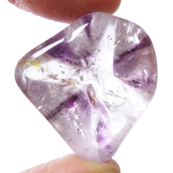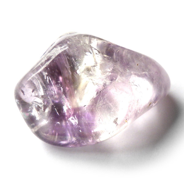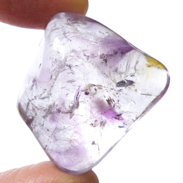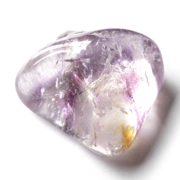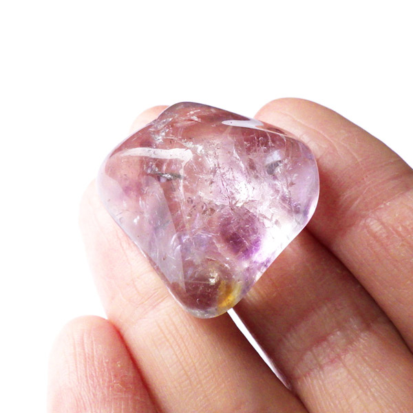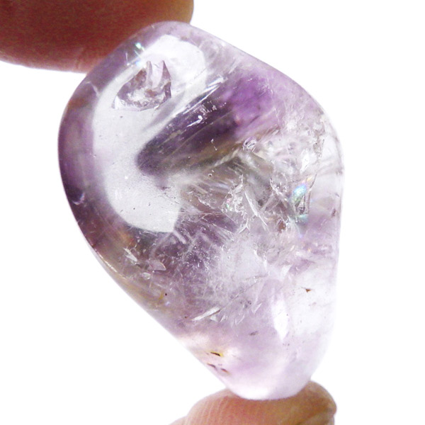 ブラジル産アメジストエレスチャル、タンブルです。エレスチャルは、水晶グループの中でも特に長い時間をかけて、特殊な成長過程を経て形成されたもののことを指し、「水晶の最終形態」とも言われています。エレスチャルの中でも、水晶の中にアメジスト部分が多く入っているものをアメジストエレスチャルと呼びます。非常に美しいインクルージョンでレインボーも確認できました。光に透かすと美しく、やっぱりいいなと見惚れてしまいます。透明度が高く紫色も濃いものは、なかなか手に入らないのでおすすめです。